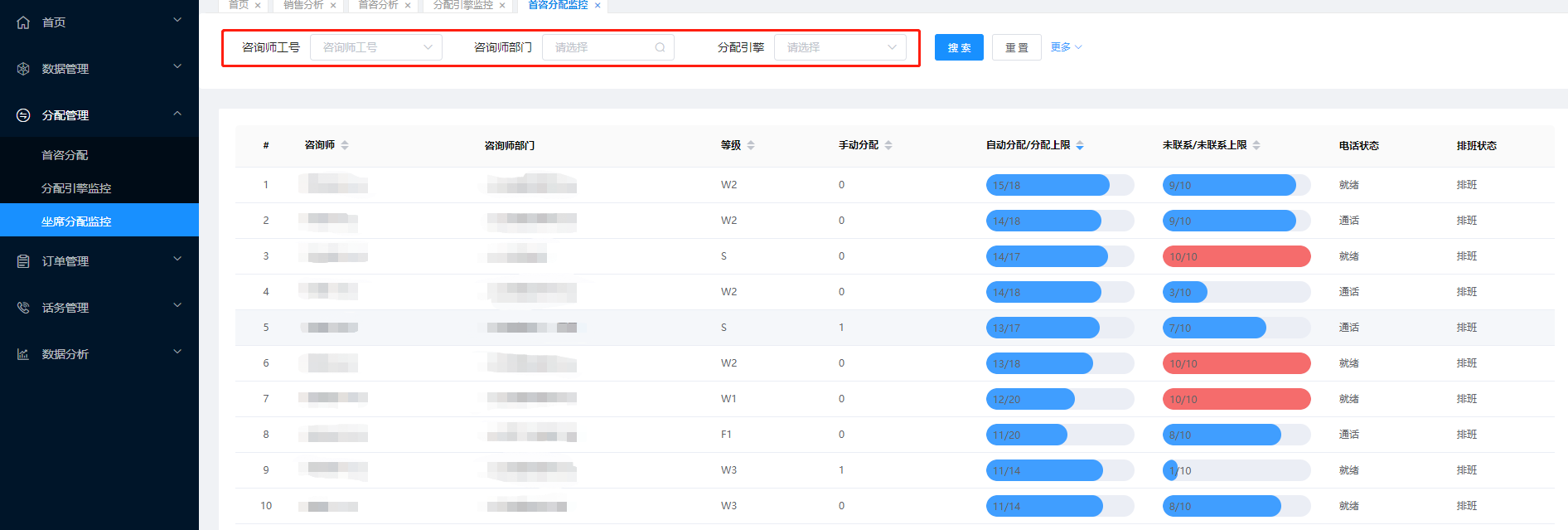 在销售咨询平台左侧菜单找到 分配管理——坐席分配监控