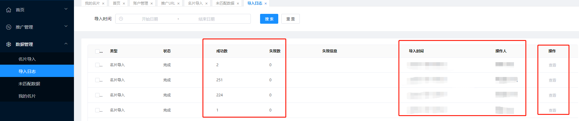 在导入日志中可以查看自己之前的名片导入情况