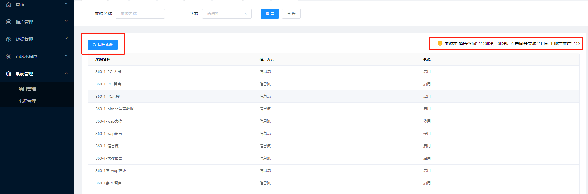 当你在销售咨询平台新建来源之后,推广平台需要进行同步,你才能找到新建的来源