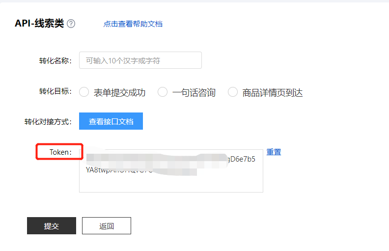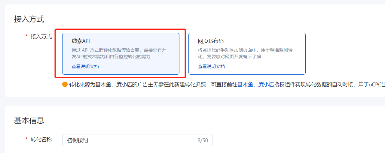 #### 步骤二:新建转化追踪,选择线索API方式