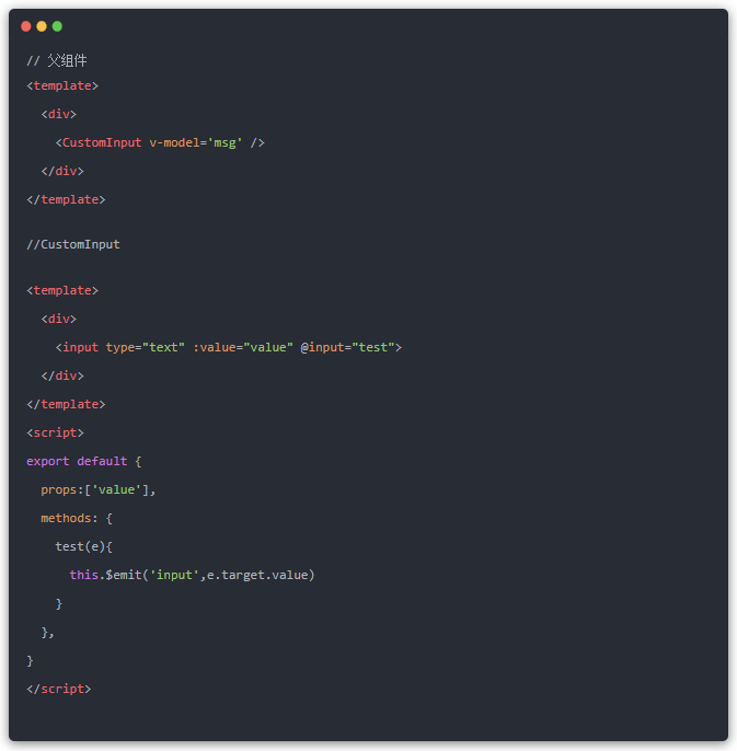 如果想在一个自定义的Input组件上使用v-model,那么就要在子组件,介绍一个value,和触发input事件,v-model的默认语法糖就是这两个东西的组合。