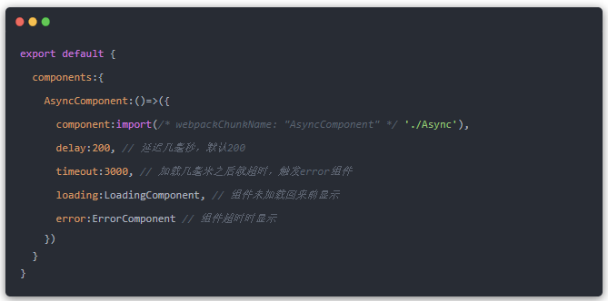 异步组件可以让我们在需要一些组件时才将它加载进来,而不是一初始化就加载进来,这跟路由懒加载时一个概念。