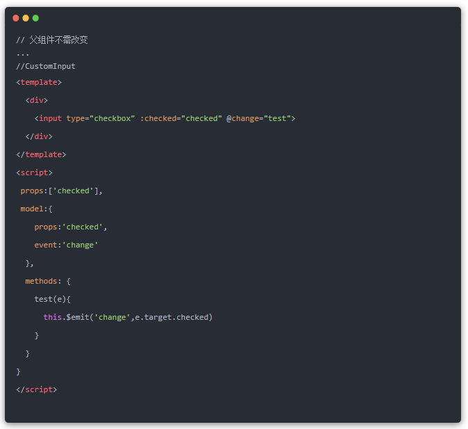 但是,如果组件里面不是input,而是一个checkbox或者一个radio呢?我不想接受一个value和input事件,我想接收一个更加语义化的checked和change事件,那该怎么办?