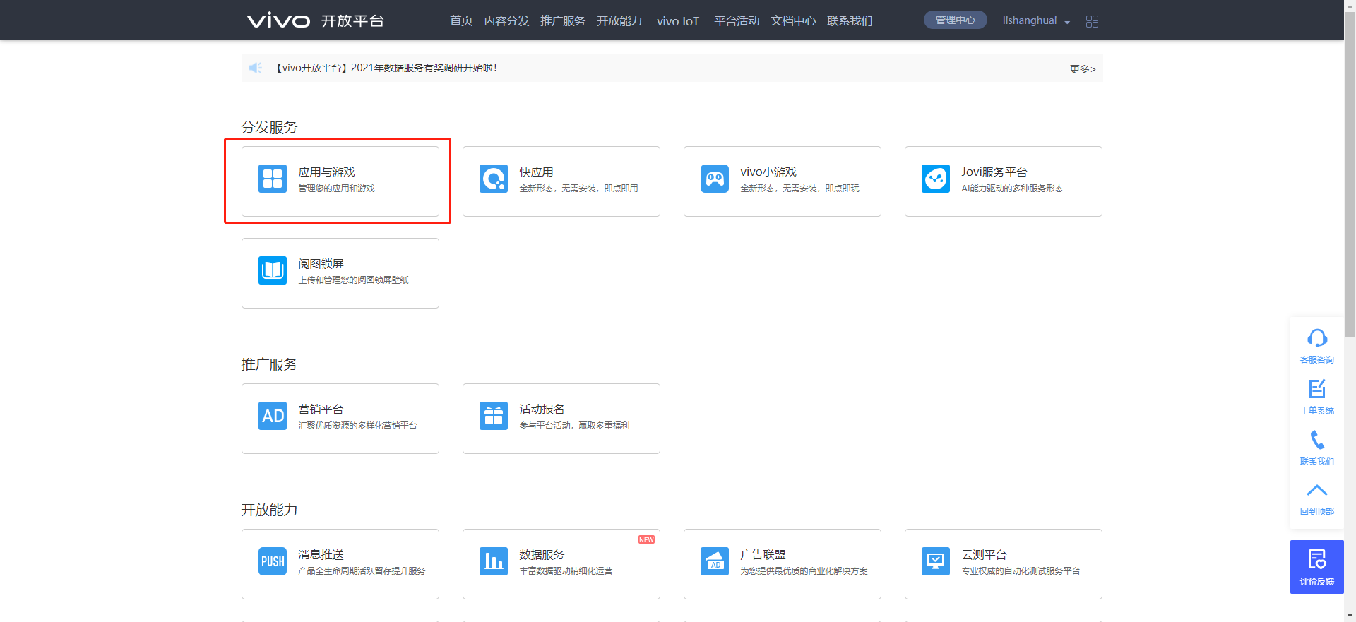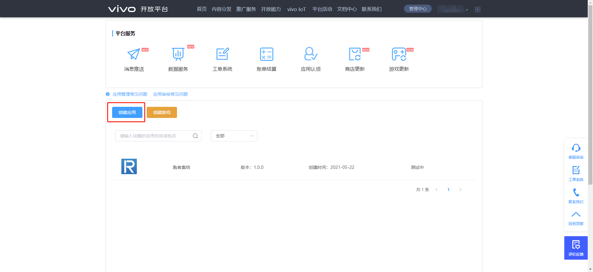 ### 登录vivo开放平台进入 **管理中心** 点击 **应用与游戏**