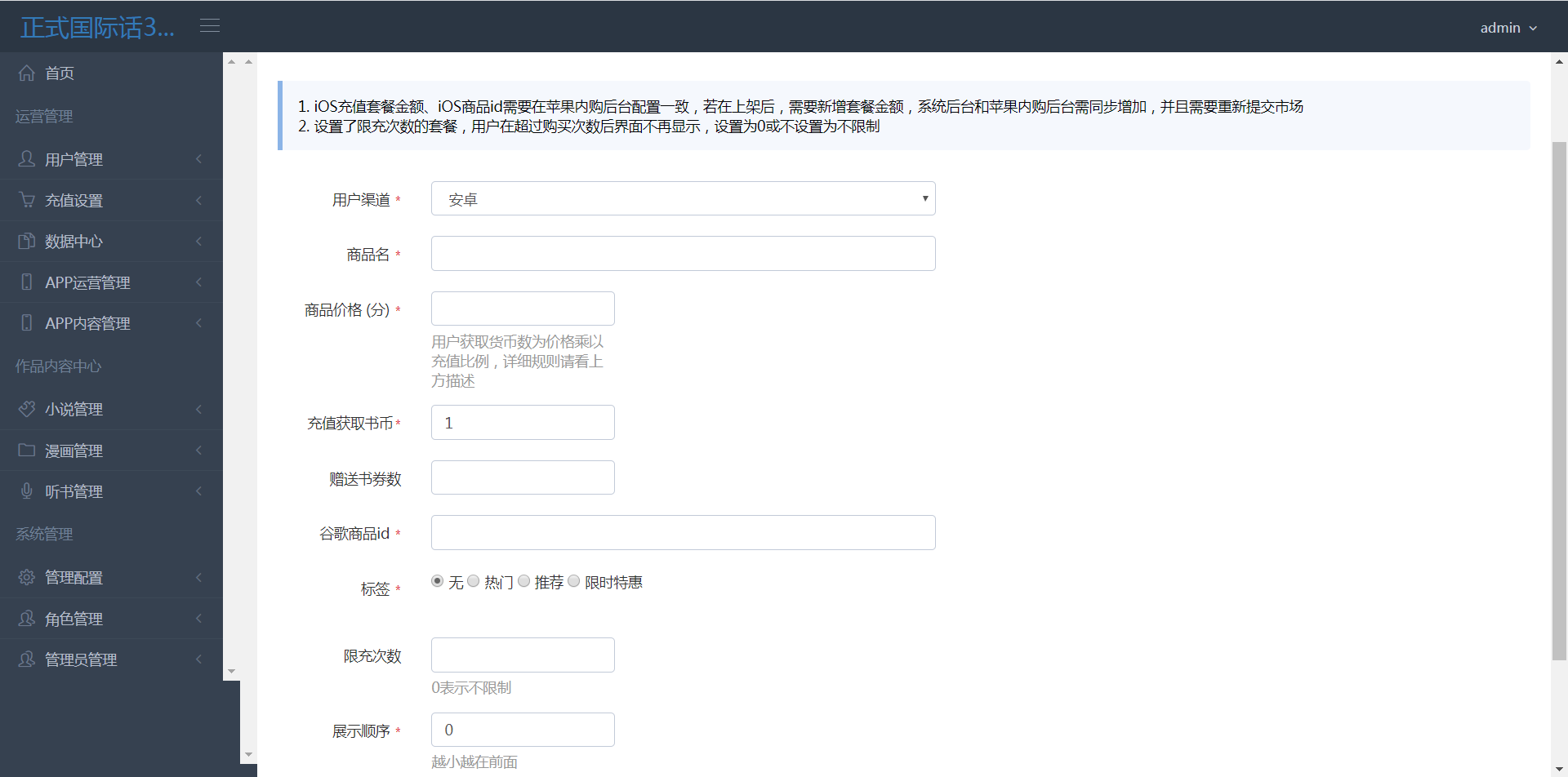 1)产品线:安卓、iOS、的充值套餐需要分别设置;**注:iOS充值套餐金额、iOS商品id需要在苹果内购后台配置一致**