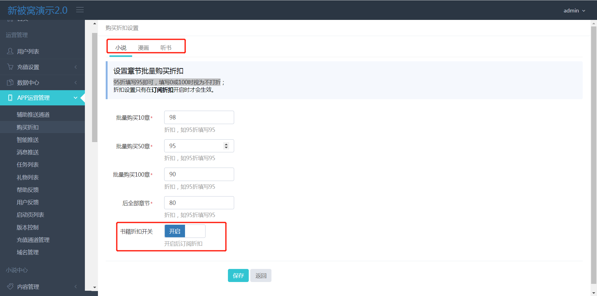 >[info] 折扣开关开启后,用户批量购买章节时,会打相对应的折扣。 95折填写95即可,填写0或100时视为不打折; 小说、漫画、有声、有单独的折扣开关。 >