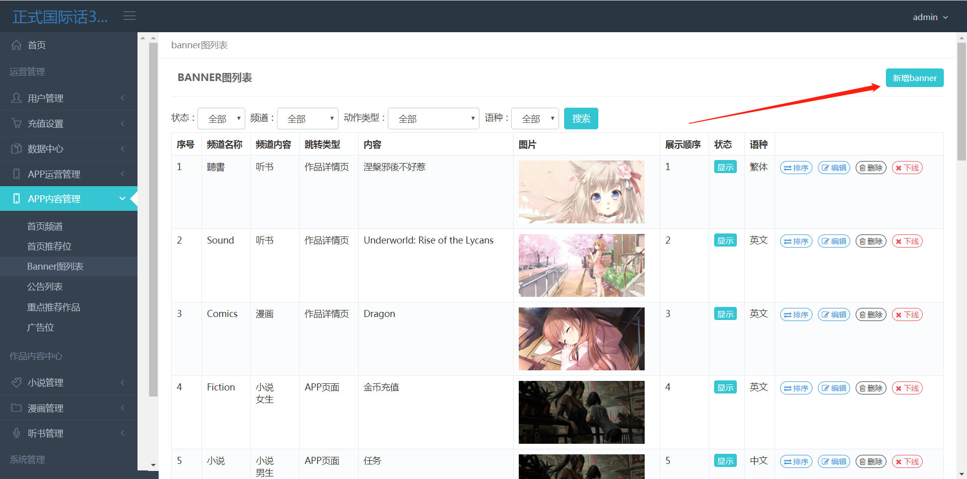 >[info]在前端首页上方展示。Banner是基于频道下的,在设置Banner之前请确认好频道,Banner图可以跳转书籍详情,app页面app内部页面和外部链接。