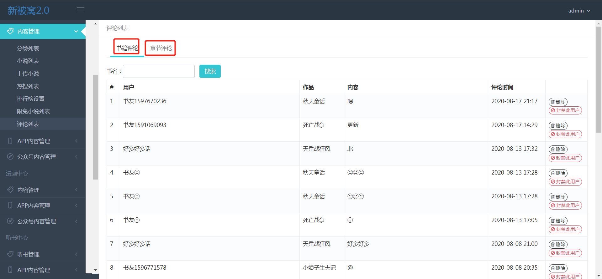 >[info]可查看所有书籍的评论(书籍评论、章节评论),可搜索和筛选指定书籍,删除评论,和封禁用户,被封禁用户无法登陆切该用户的平论不会在展示,解封用户后,评论恢复。