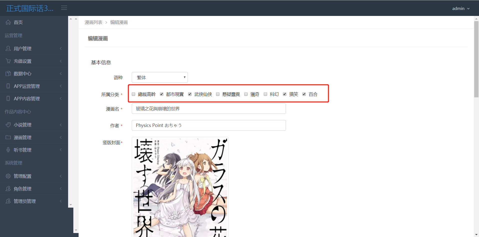 >[info] 分类会在前端展示,分类列表可以增加,编辑和删除分类。一本漫画可以对应多个分类(若要想把分类展示在首页,需要在推荐位里创建【分类】的推荐内容)
