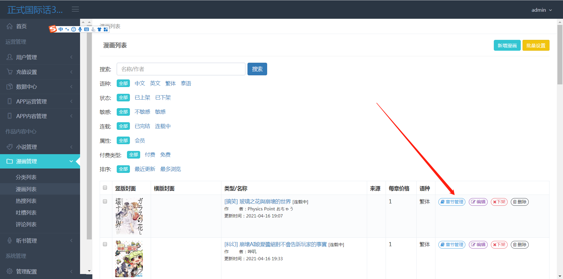 >[info] 查看所有的漫画可以搜索指定漫画,章节管理(更新章节,删除,新增),更新(修改漫画所在类别,名字,价格),对小说进行上或下架,删除,新增和批量设置