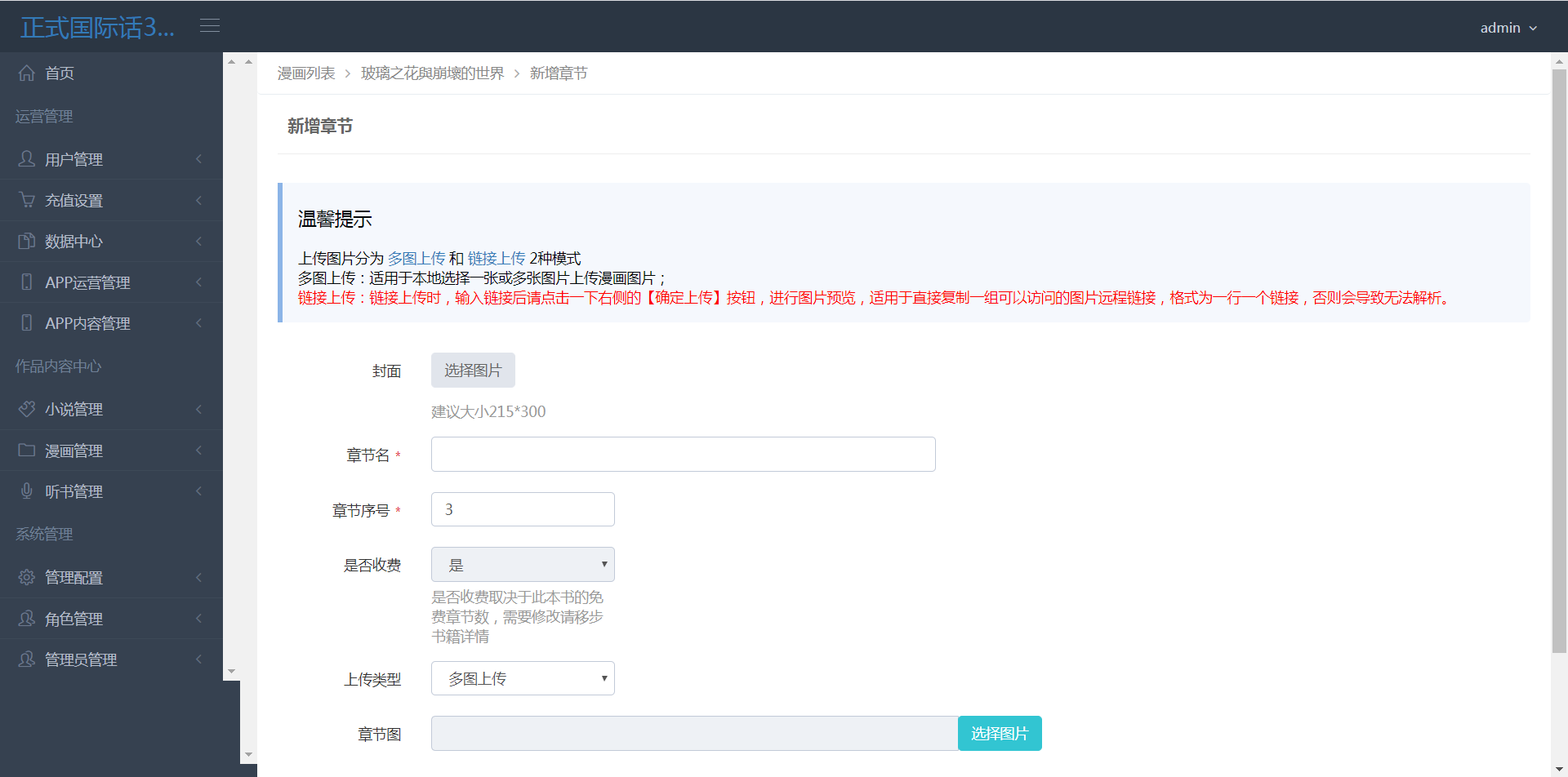 3)章节前后顺序根据章节序号决定,上传类型支持图片上传和链接上传(上传时请仔细观看后台提示)