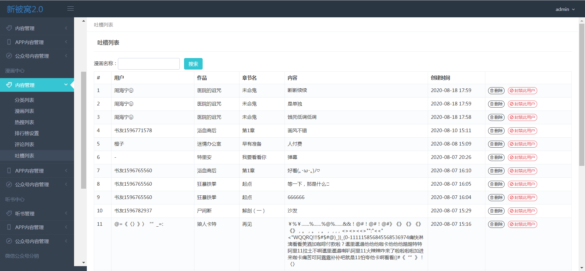 >[info]可查看所有漫画的弹幕内容,删除弹幕,和封禁用户,被封禁用户无法登陆(只有app有吐槽功能);用户发表的弹幕是针对章节的,只在该章节轮播显示;(白色字体弹出是普通用户发布的,红色是会员用户,黄色是自己发布的)