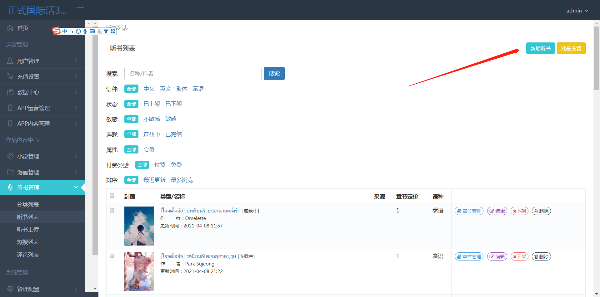 >[info] 查看所有的有声可以搜索指定小说,章节管理(更新章节,删除,新增),更新(修改小说所在类别,名字,价格),对有声进行上或下架,删除,新增和批量设置