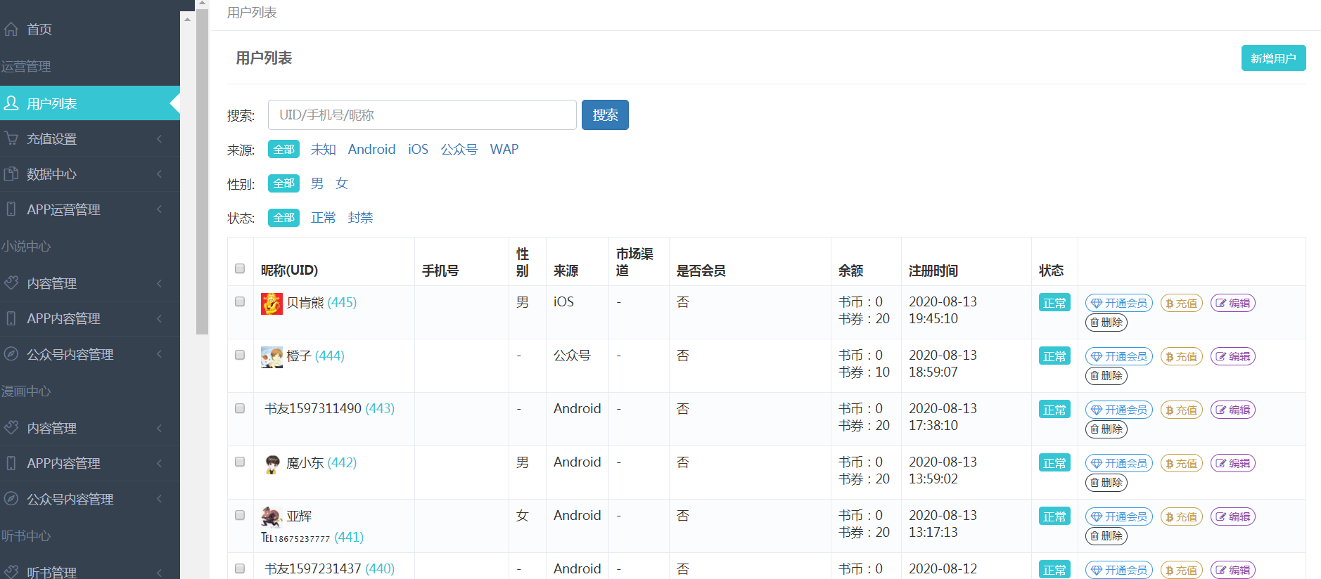 >[info] 查看所有用户包括用户的基本信息:,可筛选用户来源、渠道、性别、状态。也可以搜索指定用户,为用户开通会员、充值书币或书券、编辑用户信息、删除和新增用户。