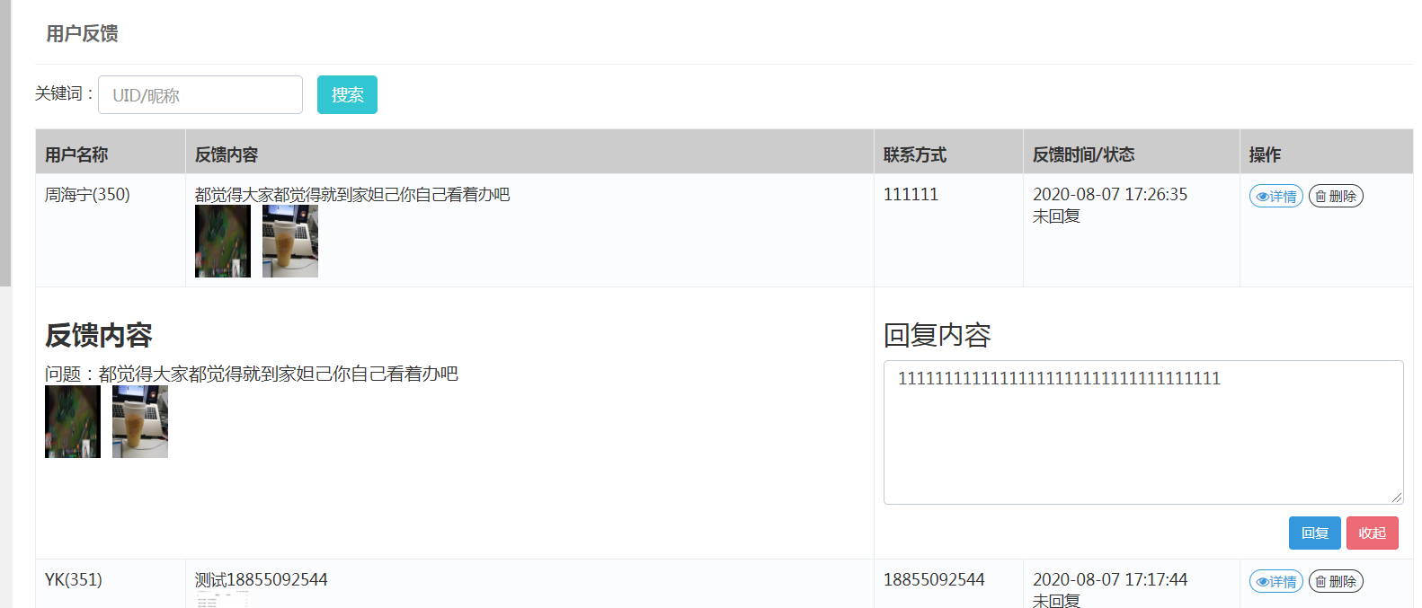 * 查看用户反馈,只有app用户才能提交意见反馈,点击详情可恢复用户反馈,每条用户反馈只能回复一条,如果回复多条,前面的回复会被替换掉