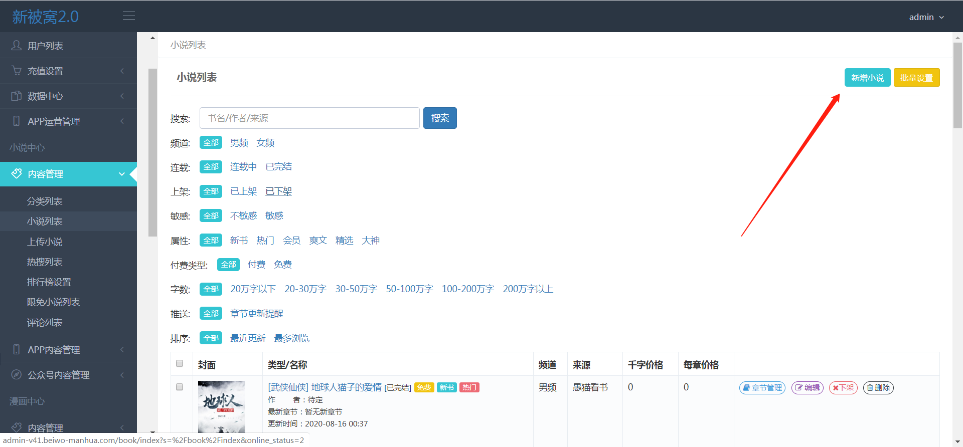 >[info] 查看所有的小说可以搜索指定小说,章节管理(更新章节,删除,新增),更新(修改小说所在类别,名字,价格),对小说进行上或下架,删除,新增和批量设置