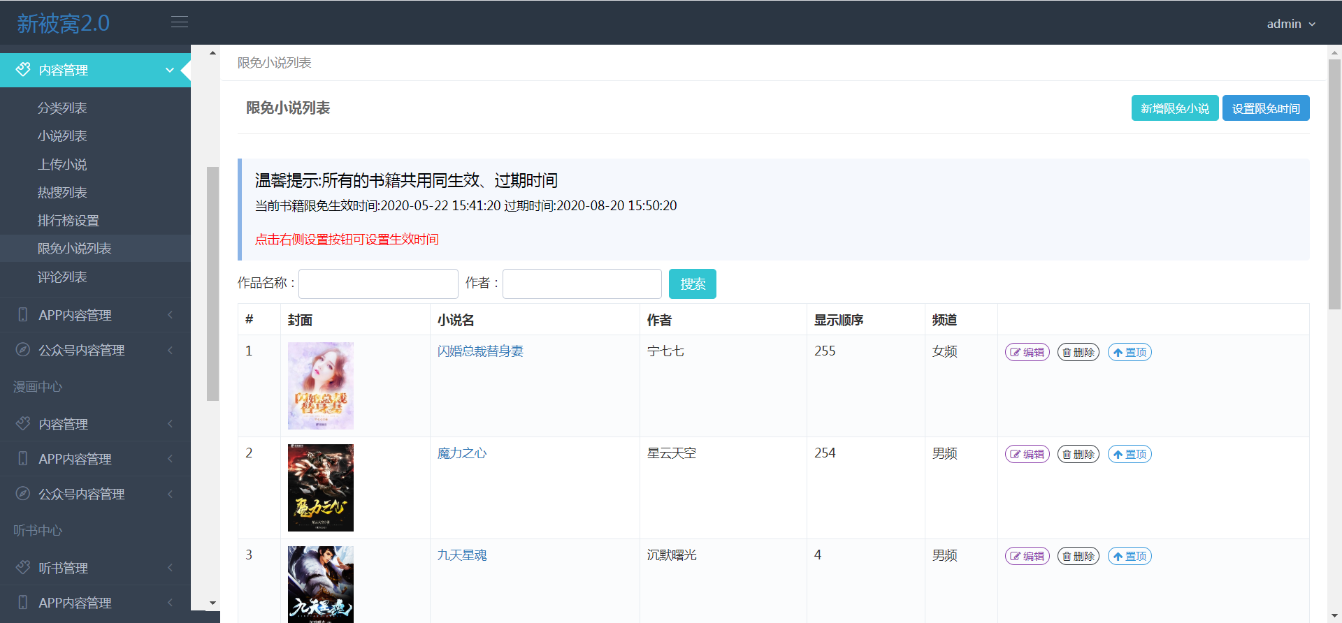 >[info]限免的书籍会在前端‘小说发现页’显示。增添删除限免书籍,可以设置限免有效时间。发现页显示的是男频的限免书籍,点击【更多】可切换男女频;**限免书籍无法下载**
