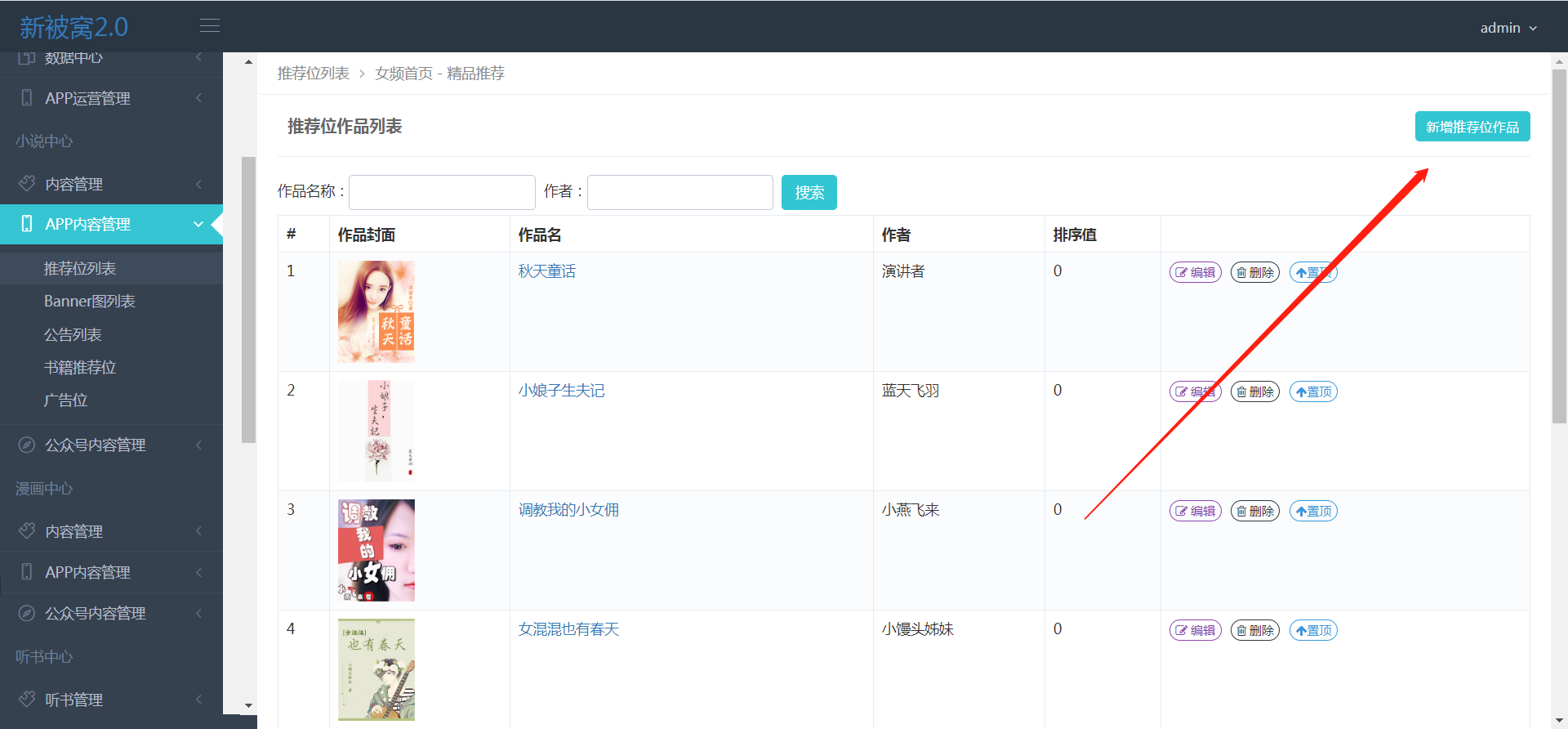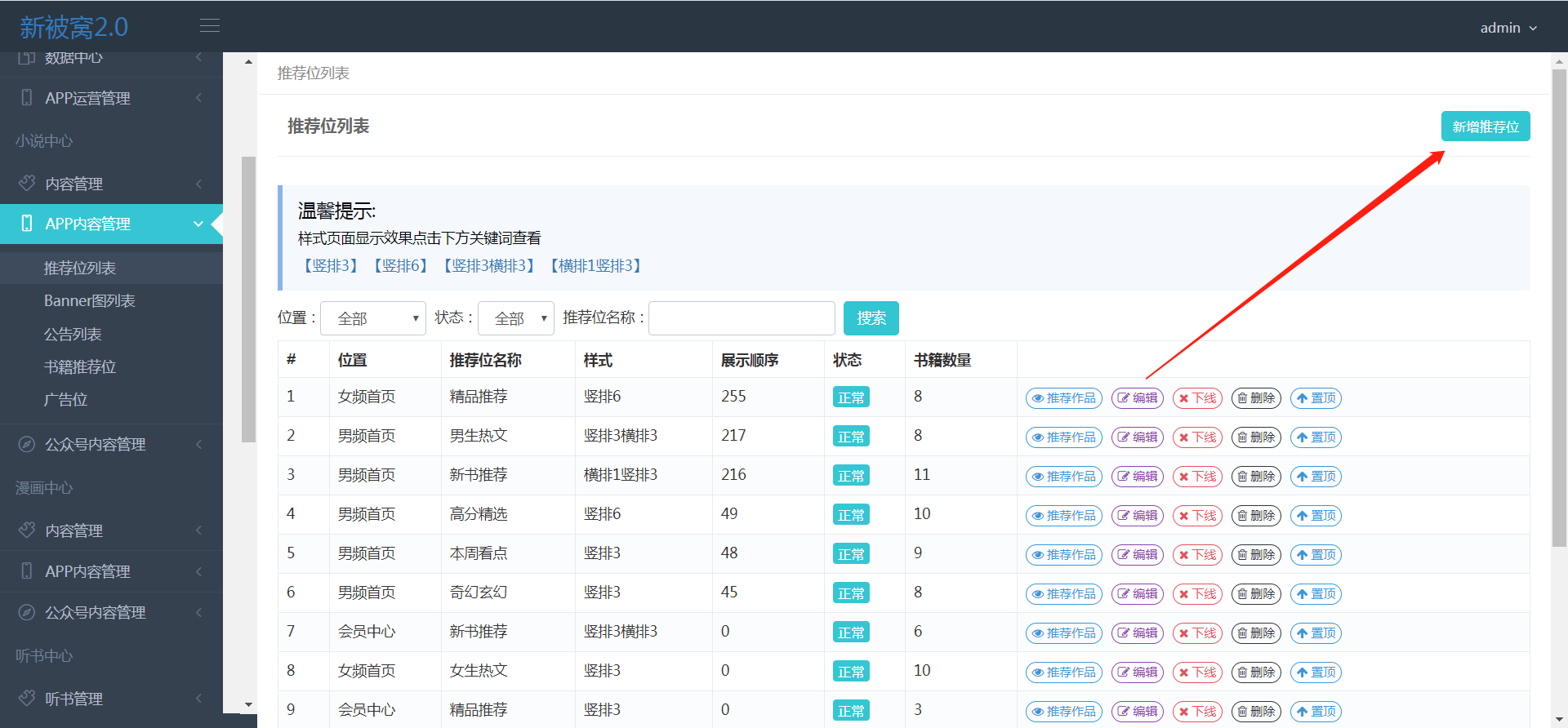 * 新增推荐位:在推荐位列表点击右上角【新增推荐位】输入推荐位信息,然后点击保存