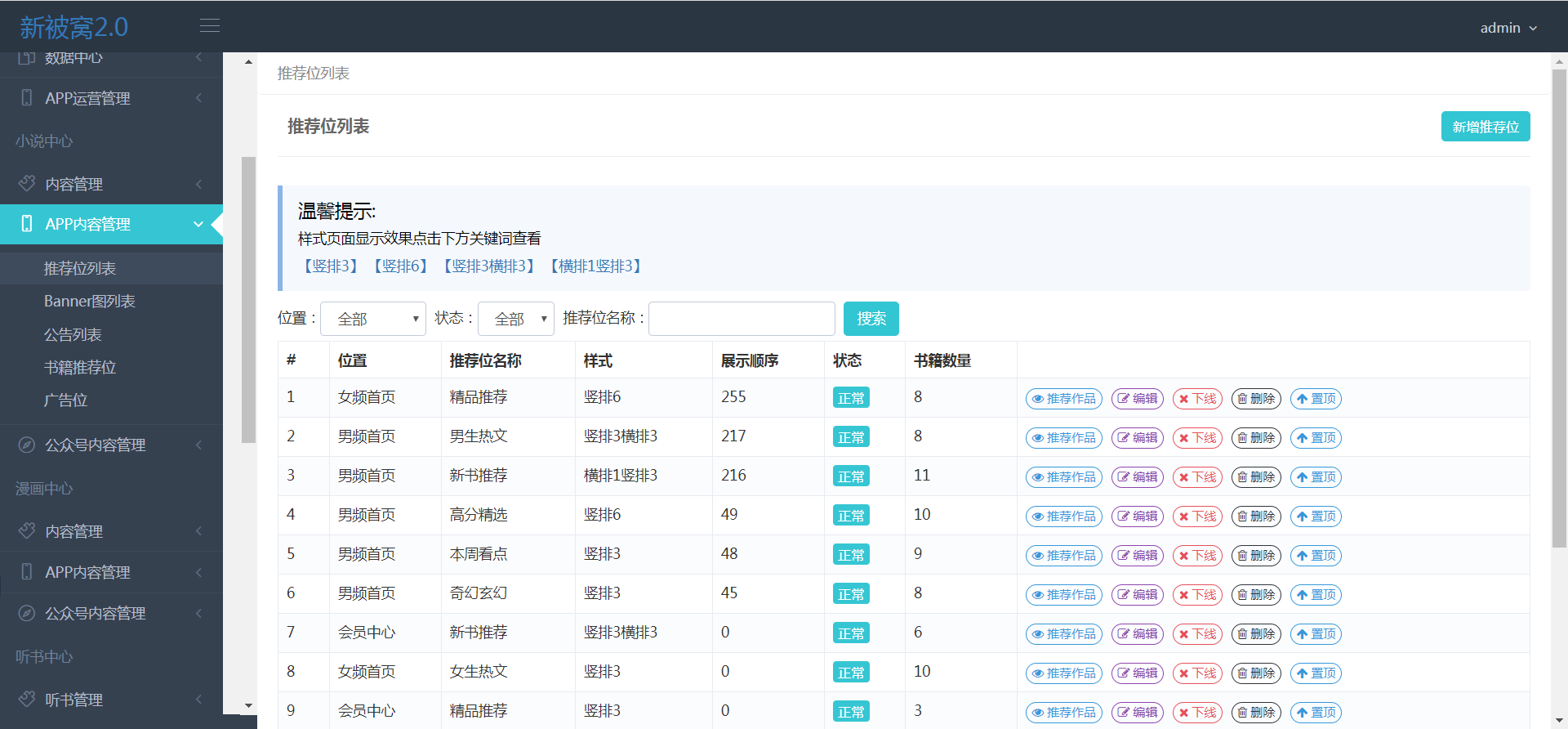 >[info]在前端展示,可以在首页、发现页、会员页 设置需要展示的书籍,推荐位可以多种展示样式。自由编辑推荐位标题。男频推荐位只能配置男频书籍,女频只能配置女频书籍,发现页没有限制