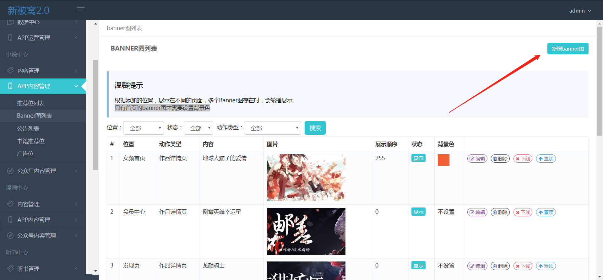 >[info]在前端首页、发现页、会员中心最上方展示。Banner图可以跳转书籍详情,app页面app内部页面和外部链接。