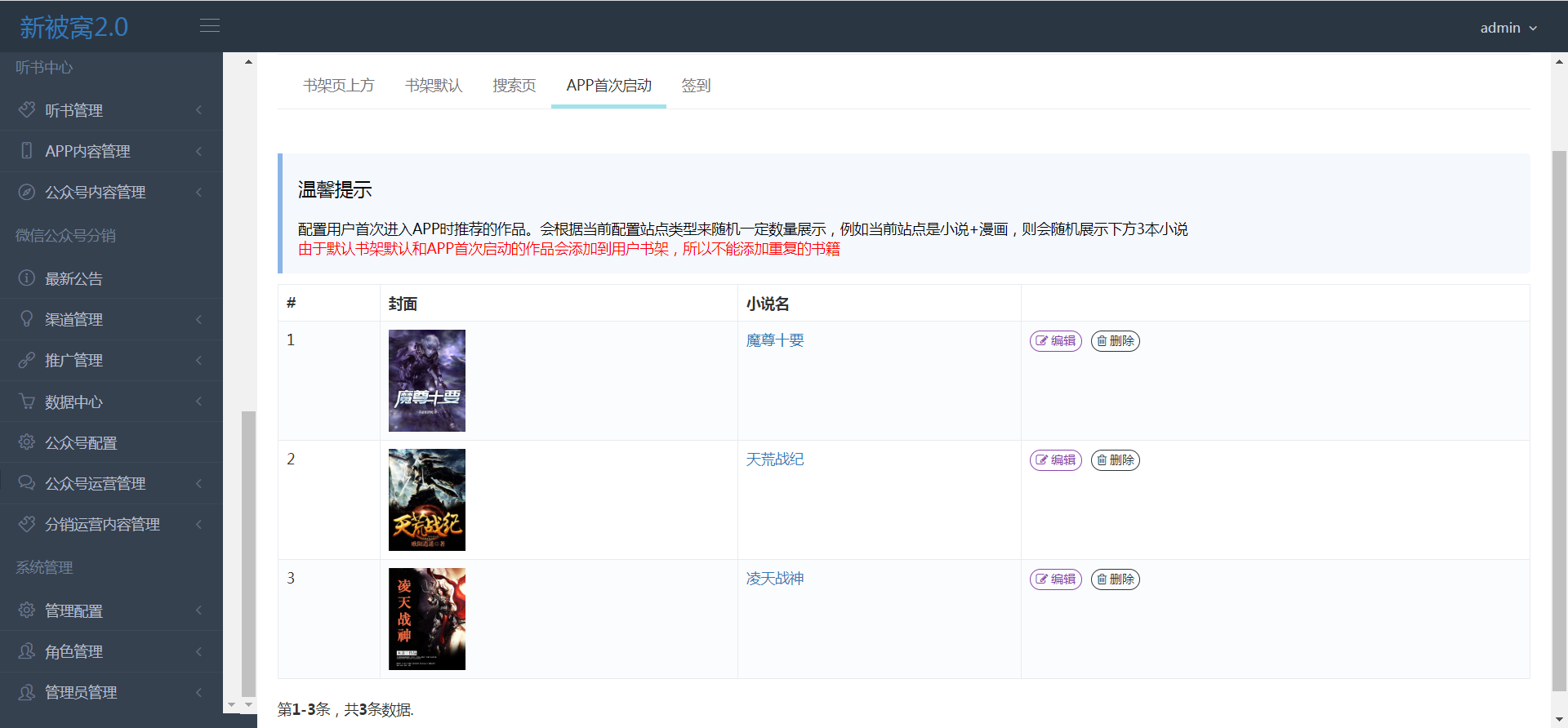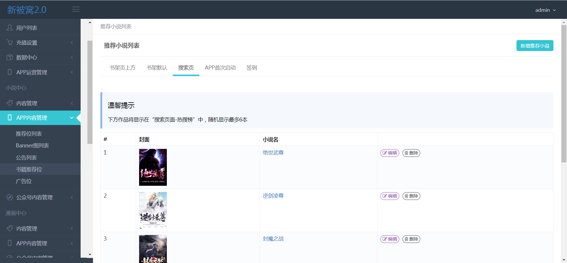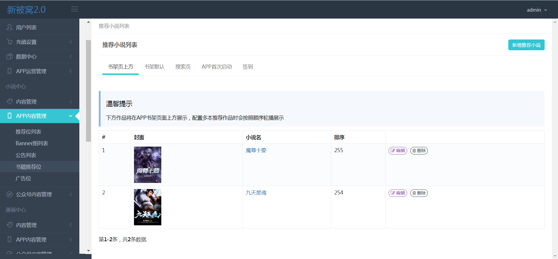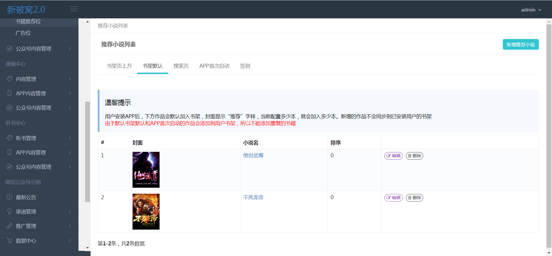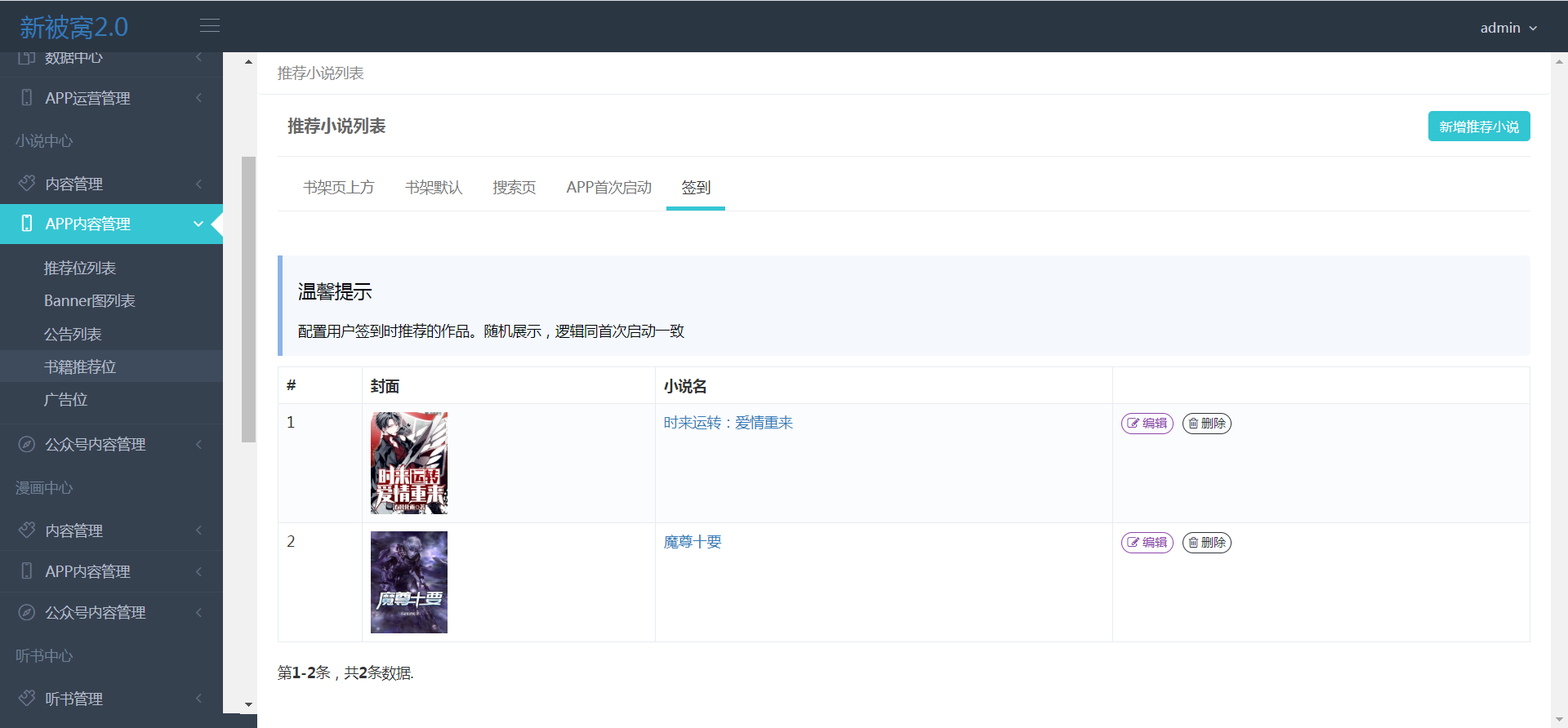 >[info]公众号只有书架页上方推荐位 * **书架页上方** 书架页上方作品将在APP书架页面上方展示,配置多本推荐作品时会按照顺序轮播展示 ![](https://img.kancloud.cn/2e/5e/2e5e01d5a8e5c08d03e0cf2e82af1c90_1920x892.png) 前端效果↓ ![](https://img.kancloud.cn/8b/de/8bde3d4aed049c5d81ac53983ca046a3_420x873.png =300x) * **书架默认** 用户安装APP后,下方作品会默认加入书架,封面显示“推荐”字样,当前配置多少本,就会加入多少本。新增的作品不会同步到已安装用户的书架; 由于默认书架默认和APP首次启动的作品会添加到用户书架,所以不能添加重复的书籍; ![](https://img.kancloud.cn/d8/0b/d80bdf559077094a3476d634c7a6b2b9_1920x892.png) 前端效果↓ ![](https://img.kancloud.cn/c0/1b/c01bbcab2294c6bf4151684640037b59_420x874.png =300x) * **搜索页** 作品将显示在“搜索页面-热搜榜”中,随机显示最多6本 ![](https://img.kancloud.cn/3d/a2/3da28f456903dcce5ce775a2c0e986da_1920x892.png) 前端效果↓ ![](https://img.kancloud.cn/a5/5d/a55d3241ecf8d8516b7f32f8a1287225_420x980.png =300x) * **app首次启动** 配置用户首次进入APP时推荐的作品。会根据当前配置站点类型来随机一定数量展示,例如当前站点是小说+漫画,则会随机展示下方3本小说; 由于默认书架默认和APP首次启动的作品会添加到用户书架,所以不能添加重复的书籍; ![](https://img.kancloud.cn/c4/28/c4285fb437de8f1e746308569e26069f_1920x892.png) 前端效果↓ ![](https://img.kancloud.cn/a3/32/a33241721b90f97920843c339c313160_420x877.png =300x) * **签到** 配置用户签到时推荐的作品。随机展示,逻辑同首次启动一致 ![](https://img.kancloud.cn/05/c8/05c8c94a95691bd47673fd9f666ef784_1920x892.png) 前端效果↓ ![](https://img.kancloud.cn/0a/0f/0a0f0a980cd82c39c66045a3b4bd8f83_420x872.png =300x)