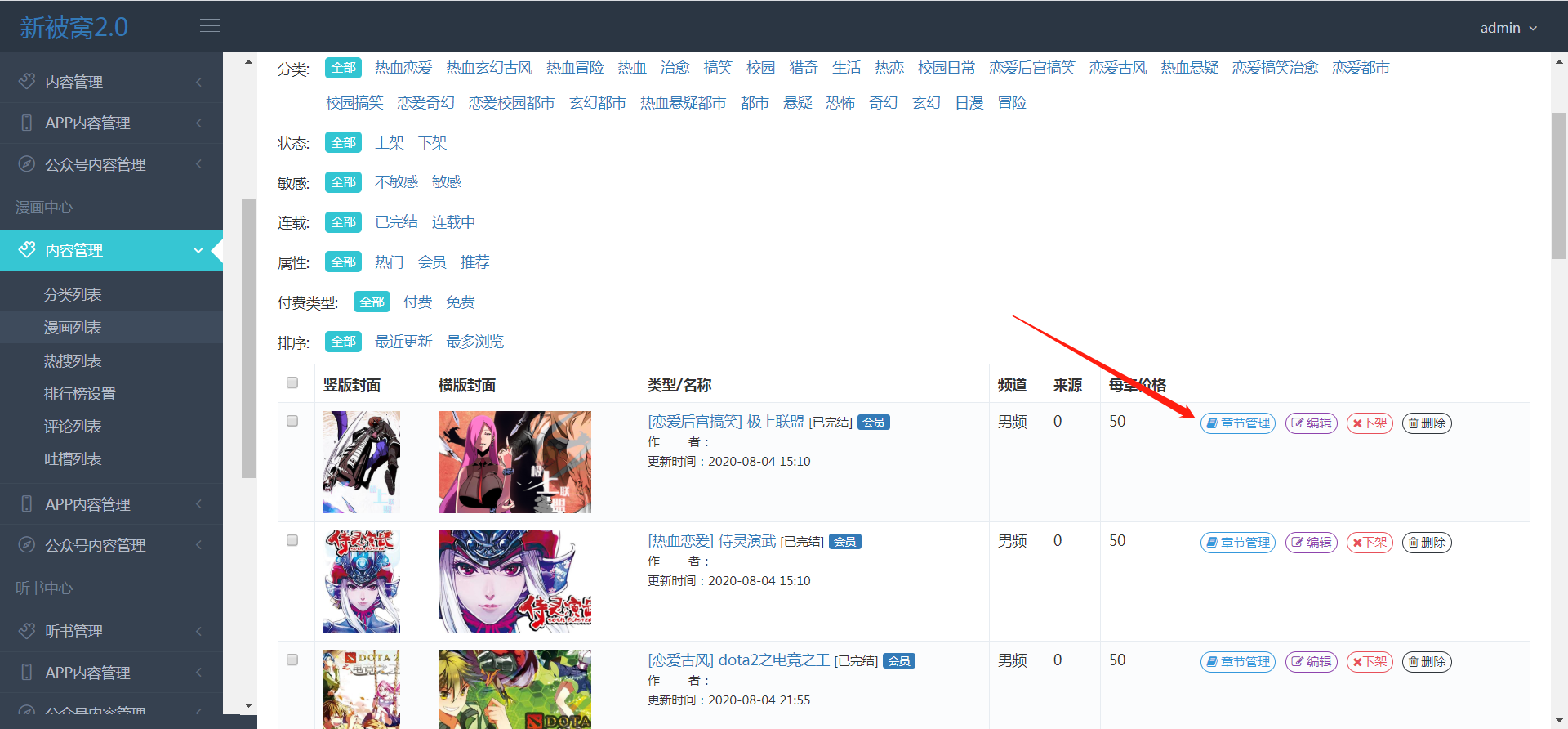 >[info] 查看所有的漫画可以搜索指定漫画,章节管理(更新章节,删除,新增),更新(修改漫画所在类别,名字,价格),对小说进行上或下架,删除,新增和批量设置