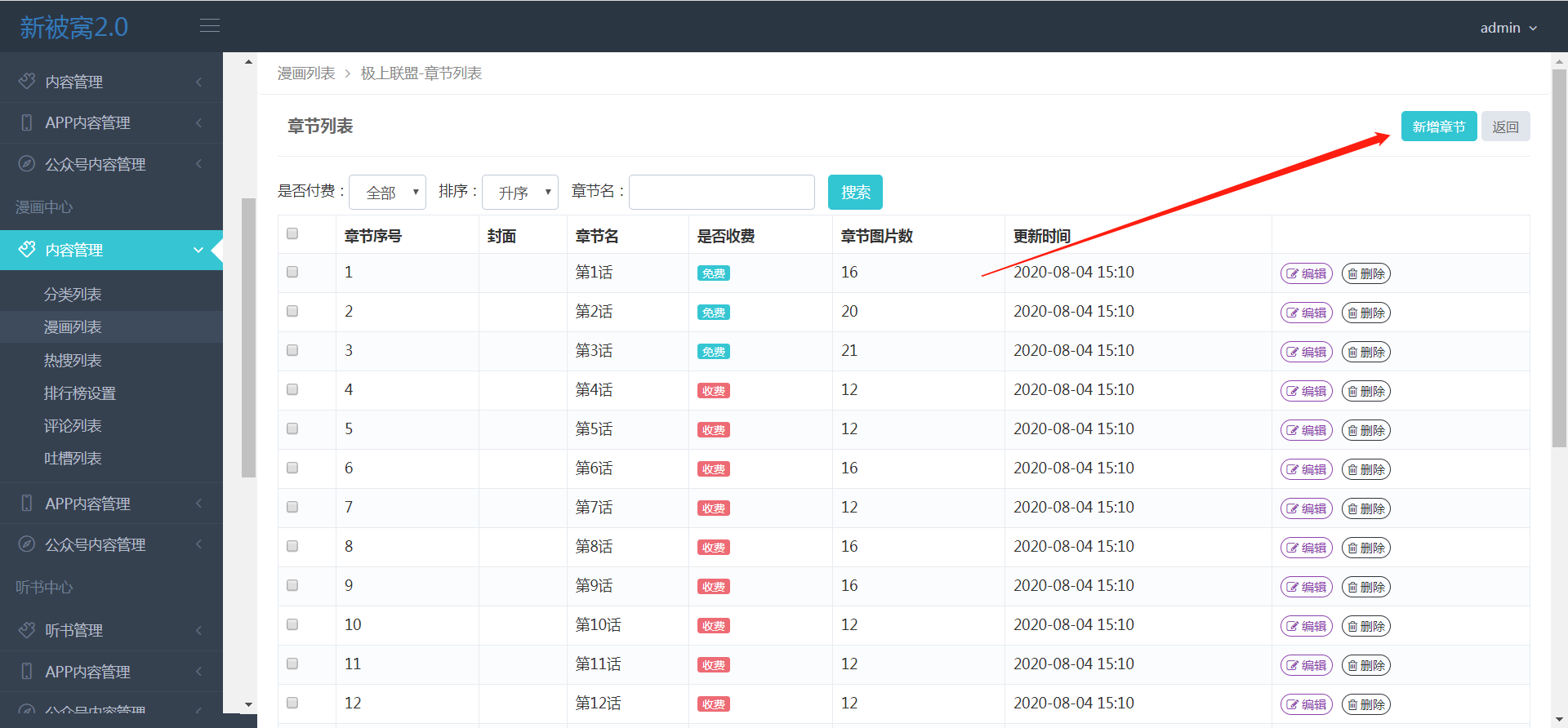 1、先新增一本漫画(**新增方式和小说一致**),然后点击章节管理