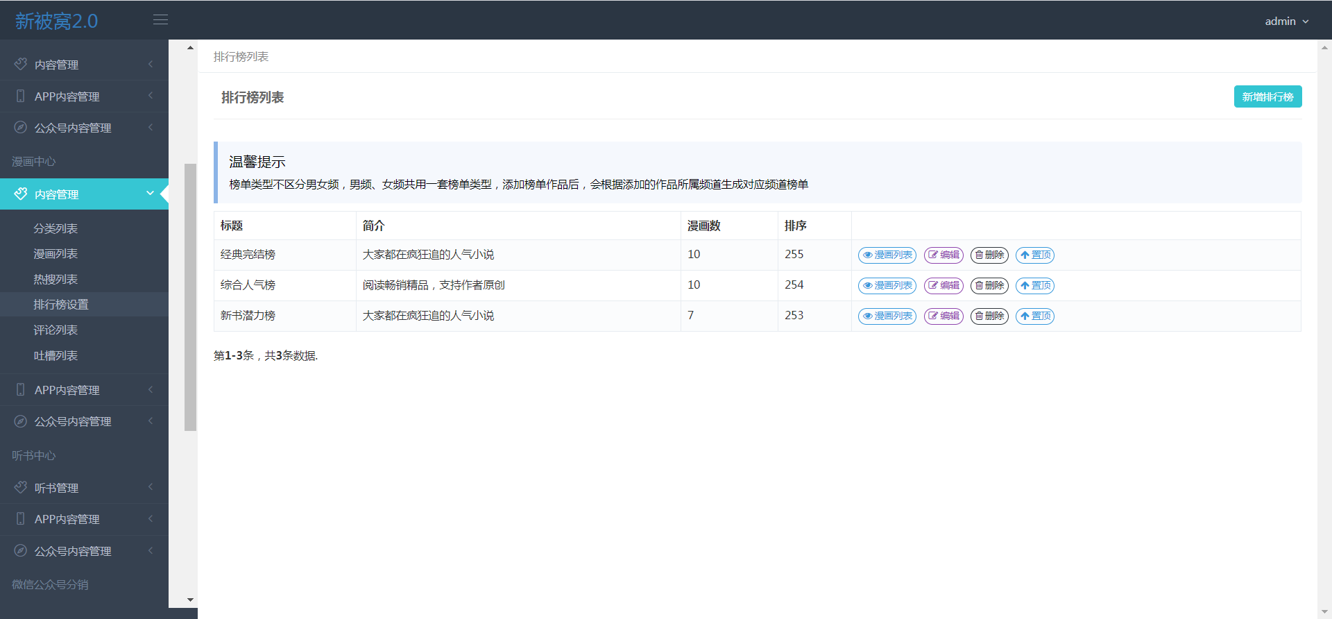 >[info]榜单名会在前端书城-排行里面显示,可以查看每个榜单里面的书籍列表(可以对榜单里面的书籍更新、删除、置顶),根据自己的需求来修改榜单名,和删除榜单名和增添。男女频共用一个榜单,但是男女频的书籍时分开的。 ![](https://img.kancloud.cn/a9/56/a956b2af050b346ff64624f2c3659f69_1920x892.png) 前端效果↓ ![](https://img.kancloud.cn/d4/93/d493dad989b6ed3b26f182017a3391f5_420x869.png =300x)