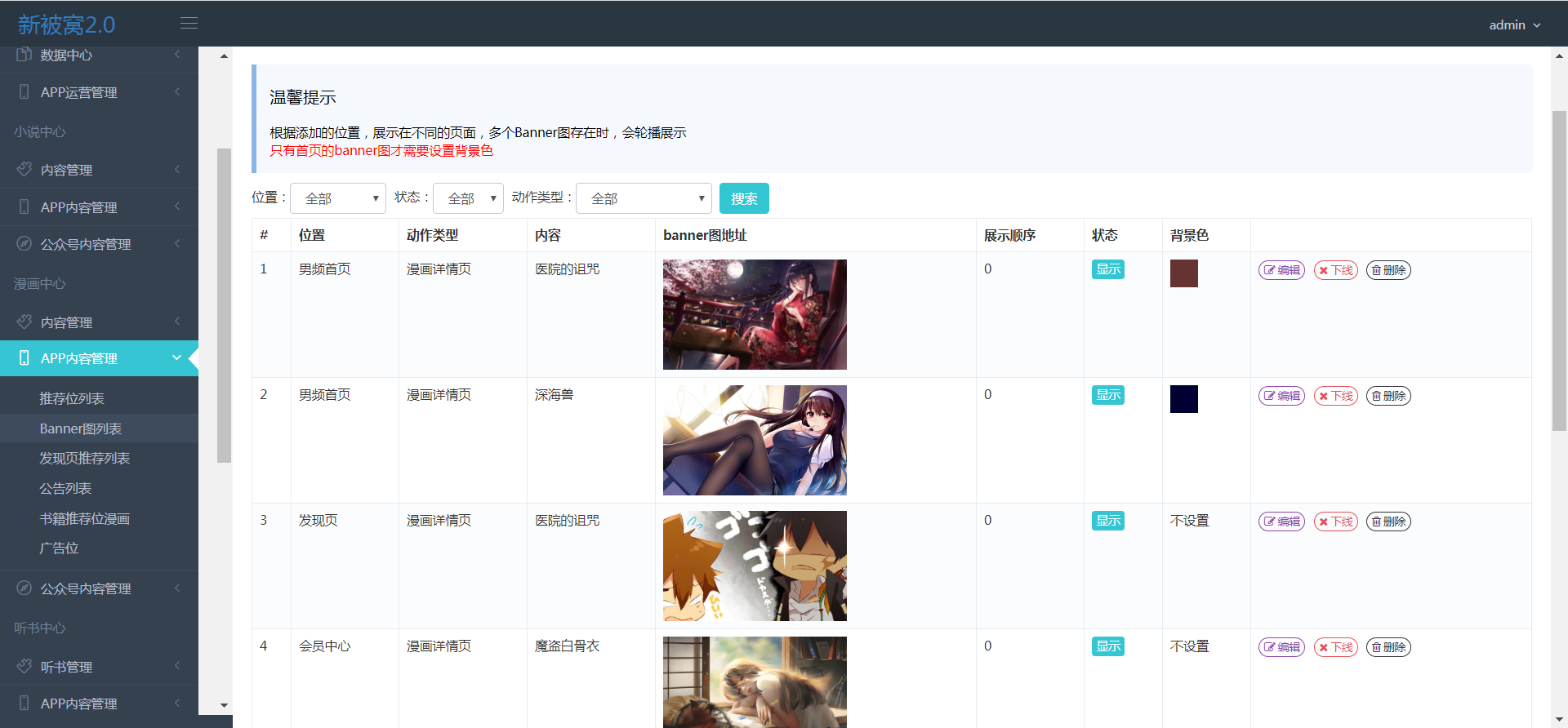>[info]在前端首页、发现页、会员中心最上方展示。Banner图可以跳转书籍详情,app页面app内部页面和外部链接。 多个Banner图存在时,会轮播展示 只有首页的banner图才需要设置背景色 ![](https://img.kancloud.cn/0b/93/0b936cf85ab7d960a6a380e9f873edc2_1920x892.png) 前端效果↓ ![](https://img.kancloud.cn/8a/ad/8aad1268b665e6ea4f145ed01b1183bf_420x876.png =300x)