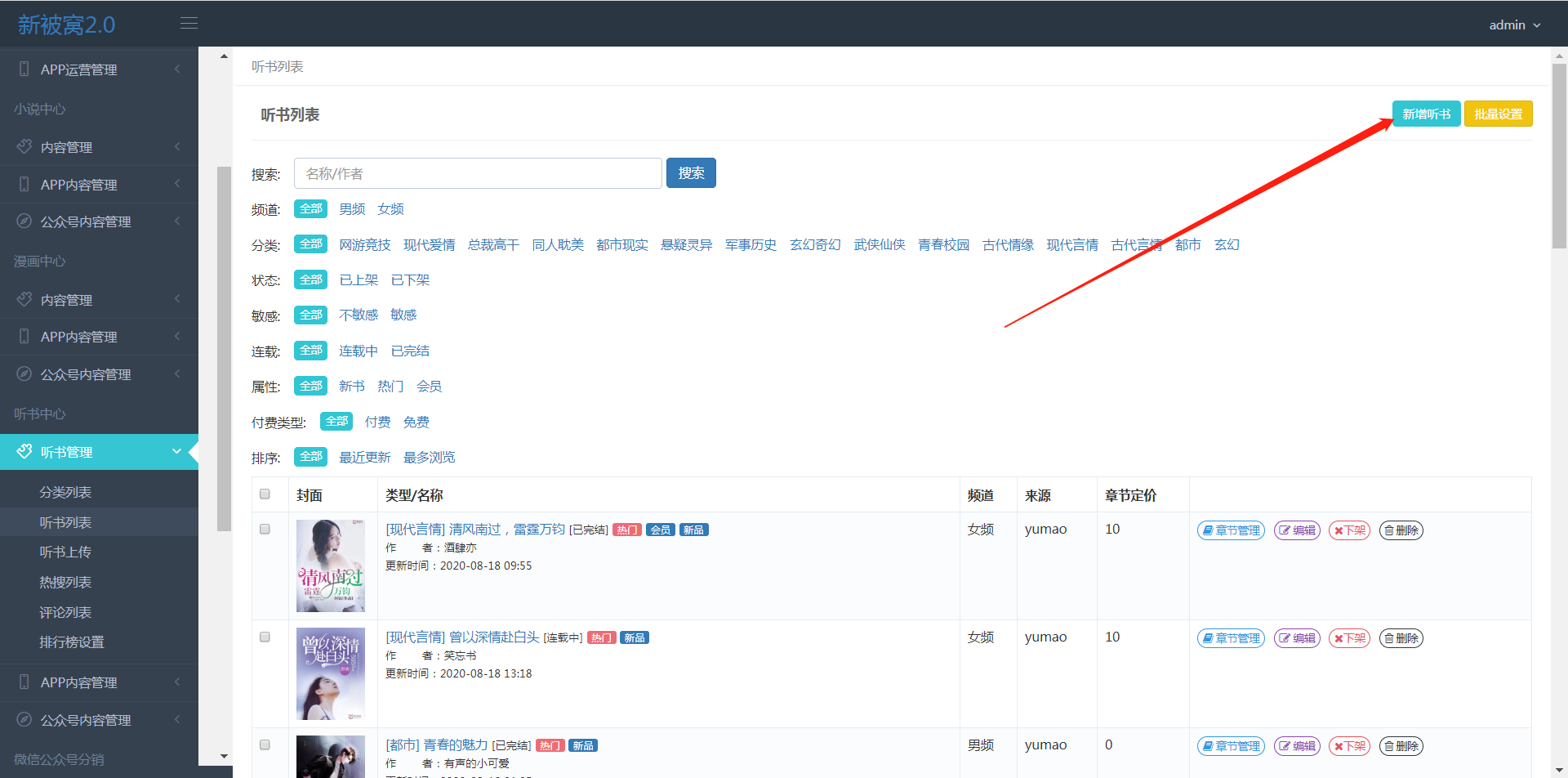 >[info] 查看所有的有声可以搜索指定有声,章节管理(更新章节,删除,新增),更新(修改有声所在类别,名字,价格),对小说进行上或下架,删除,新增和批量设置