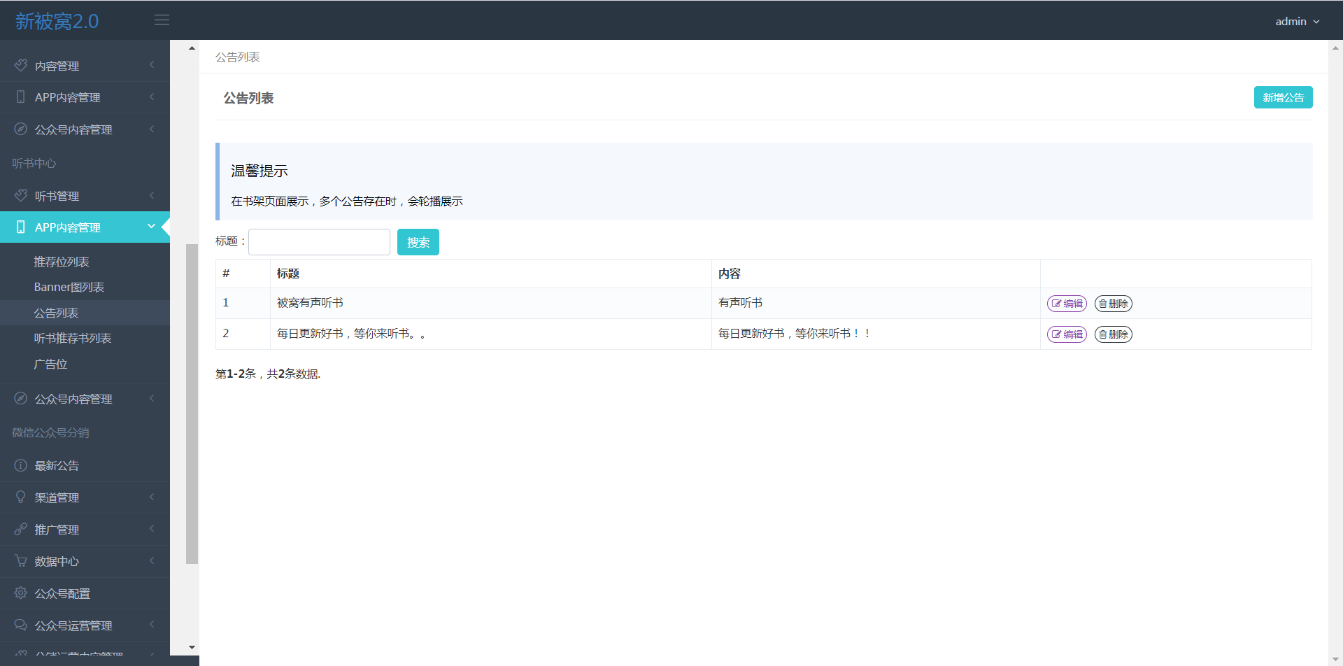 >[info]在前端书架页展示,可以更新、删除和新增公告。 多个公告存在时,会轮播展示 ![](https://img.kancloud.cn/0c/f5/0cf5e553ee68941d726cdf1cfdce3527_1920x952.png) 前端效果↓ ![](https://img.kancloud.cn/1b/f2/1bf270d8f9067d5c1408e8d8fae7bac7_420x882.png =300x)
