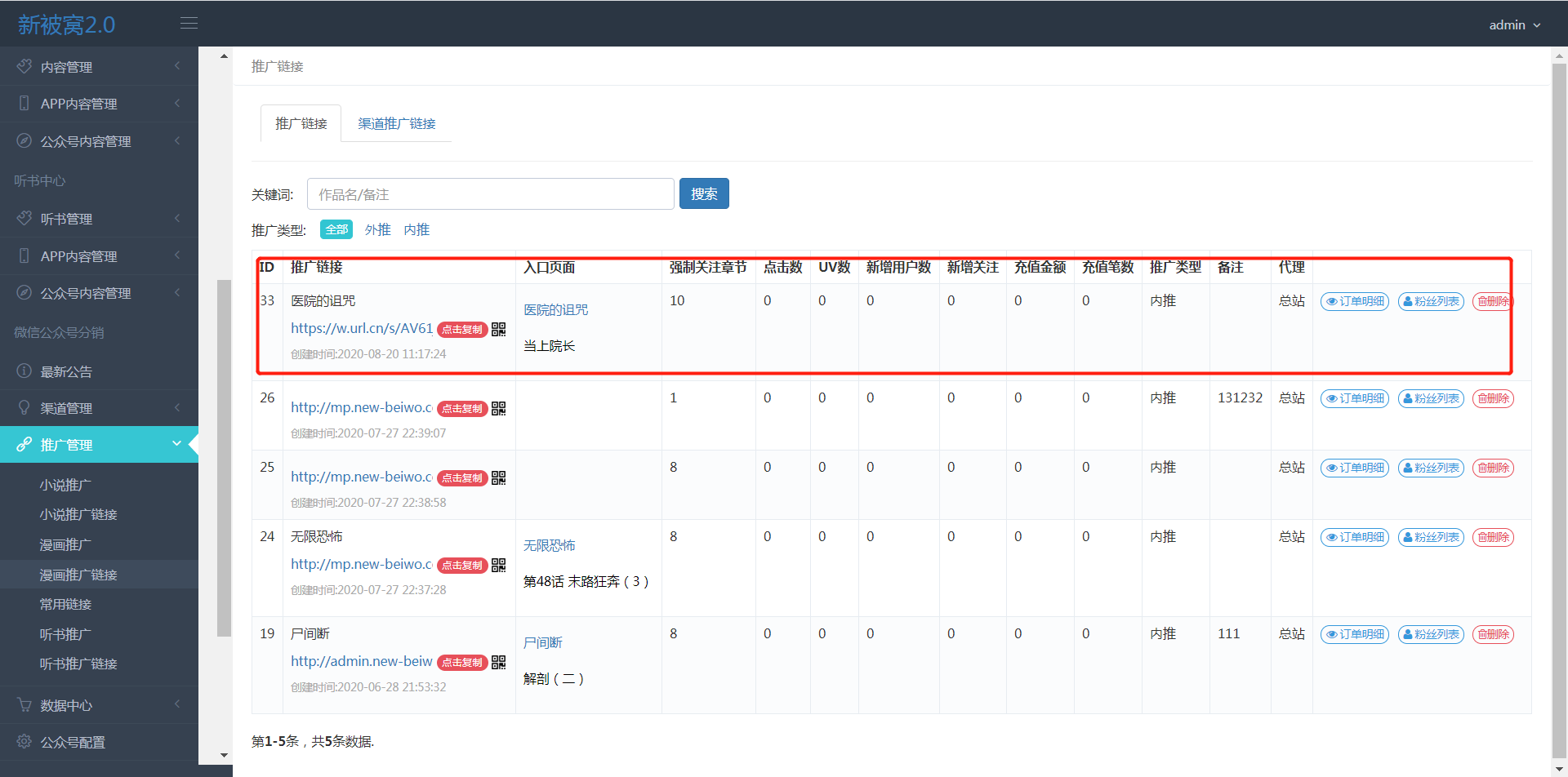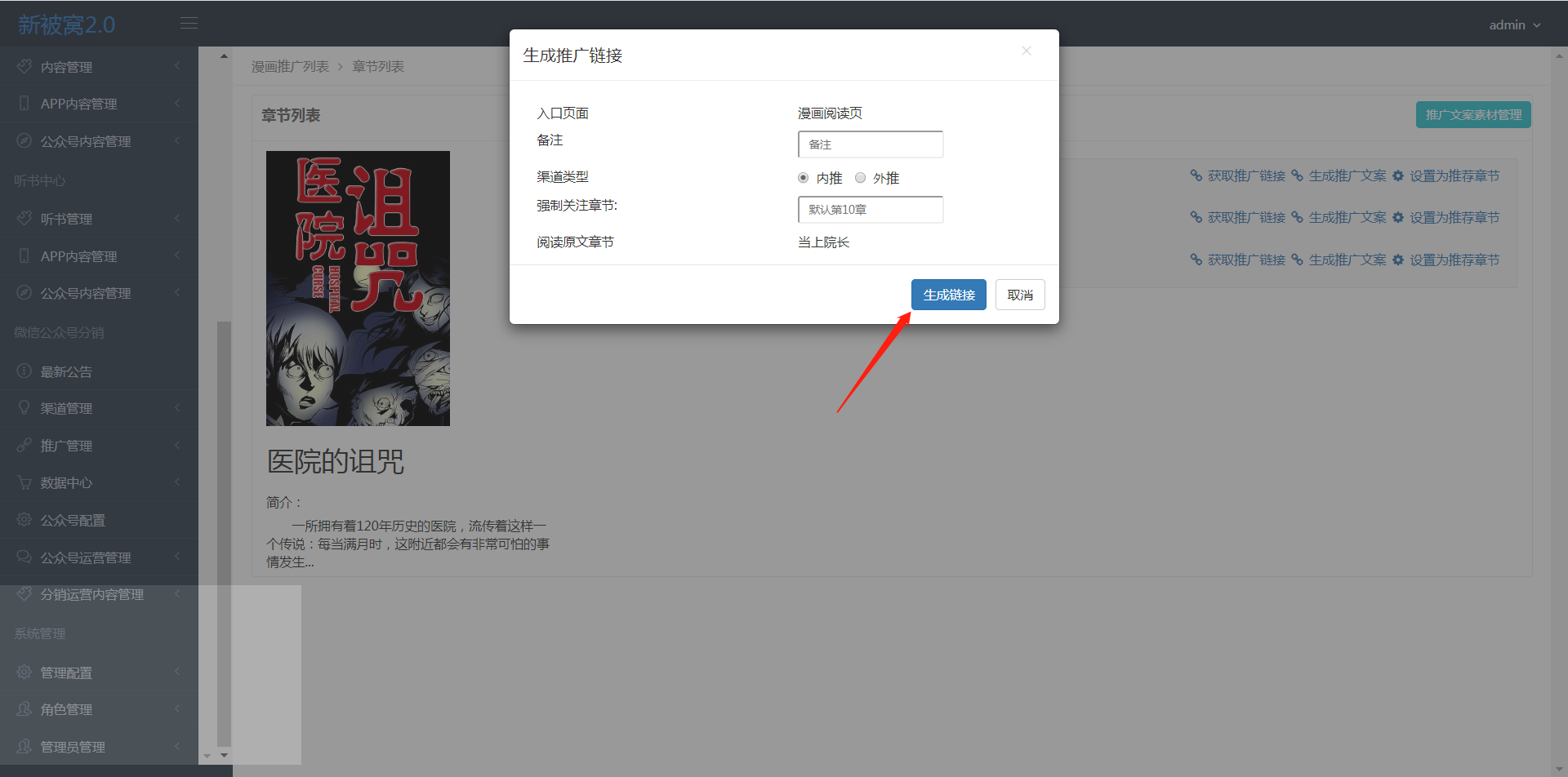 >[info]此功能是获取漫画章节的推广链接,进行推广。用户可以通过链接来关注公众号进行充值付费。