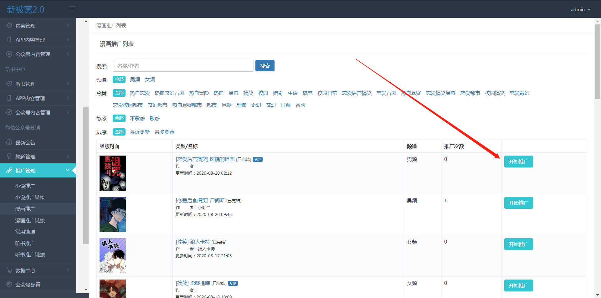 1、点击漫画列表的【开始推广】,进入章节列表,(章节列表里只会显示免费章节,且最多显示前二十章)