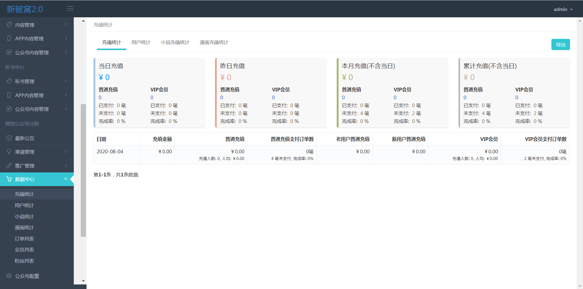 查看用户充值情况,可查看当日充值、昨日充值、本月充值和累计充值。