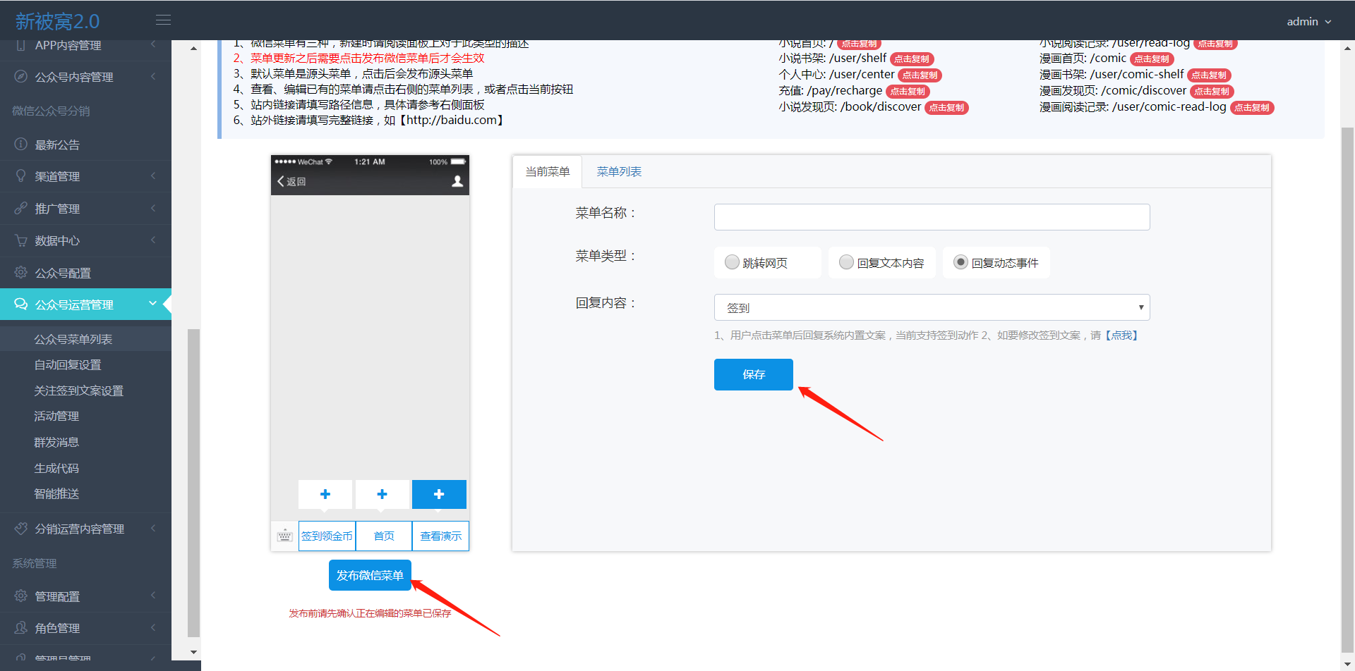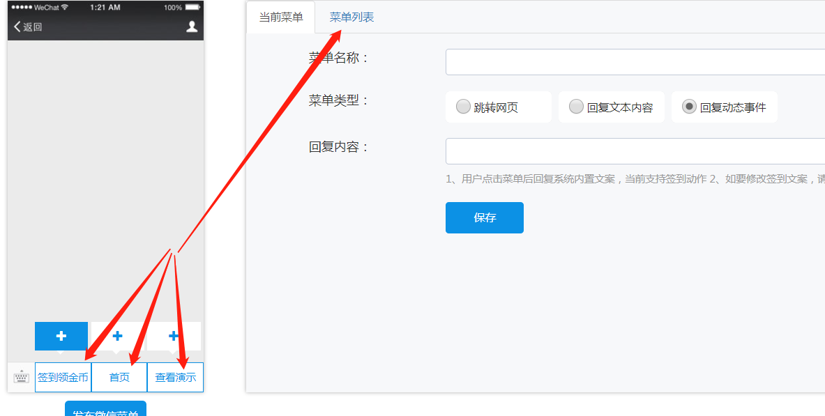 >**菜单更新之后需要点击发布微信菜单后才会生效**