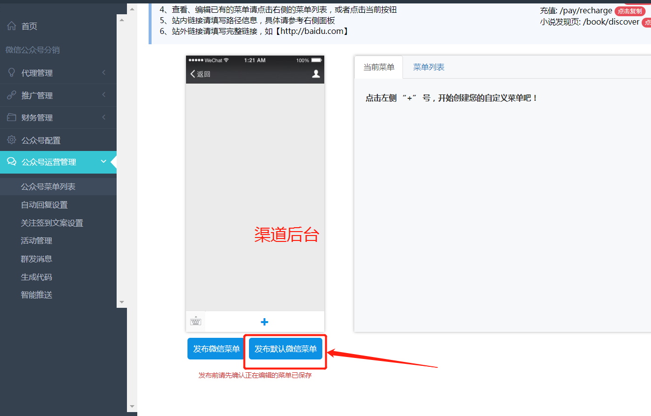 **注:渠道后台默认菜单是源头菜单,渠道可自己编辑,如果想同步源头菜单的话,点击【发布微信默认菜单】**
