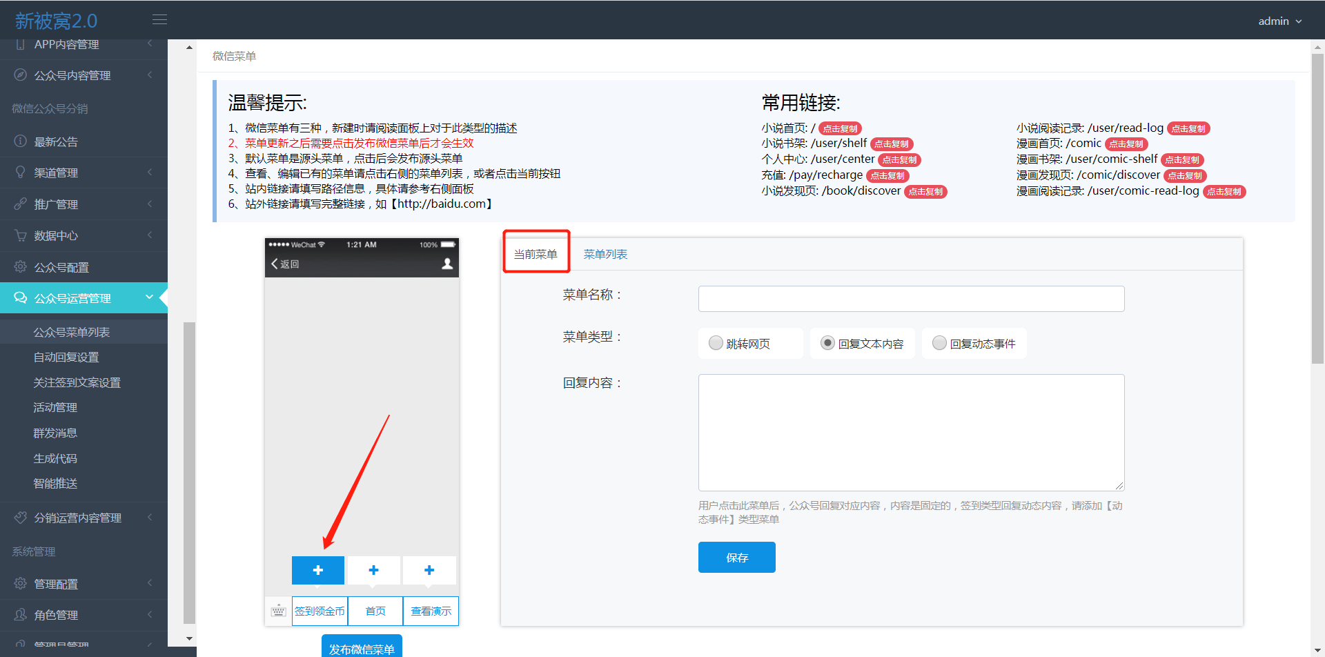1、点击加号,在右侧当【当前菜单】编辑菜单信息(注:**如果设置了二级目录,一级目录则无效**)