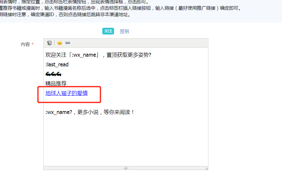 >[info] 此处为用户关注和签到后,提示的文案,在设置前请仔细查看温馨提示