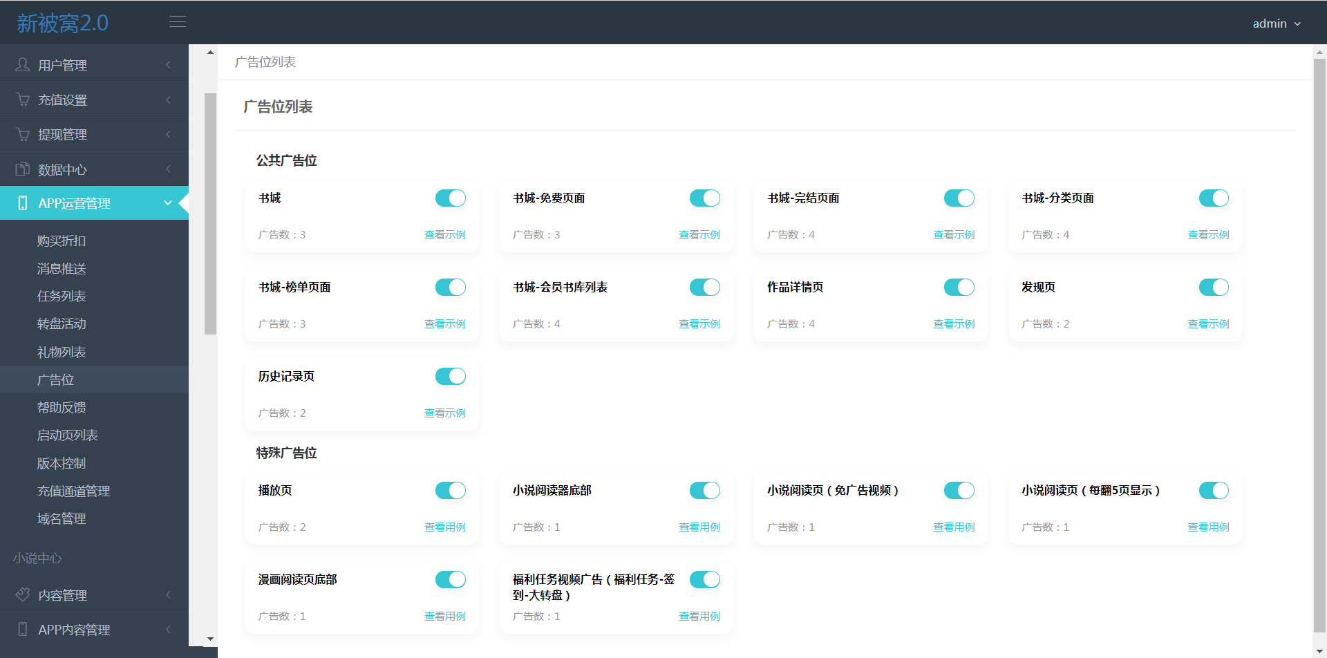 首页、详情页、阅读章节末尾页、发现页,展示形式是只展示一条广告,每次访问会随机展示列表里的广告;
