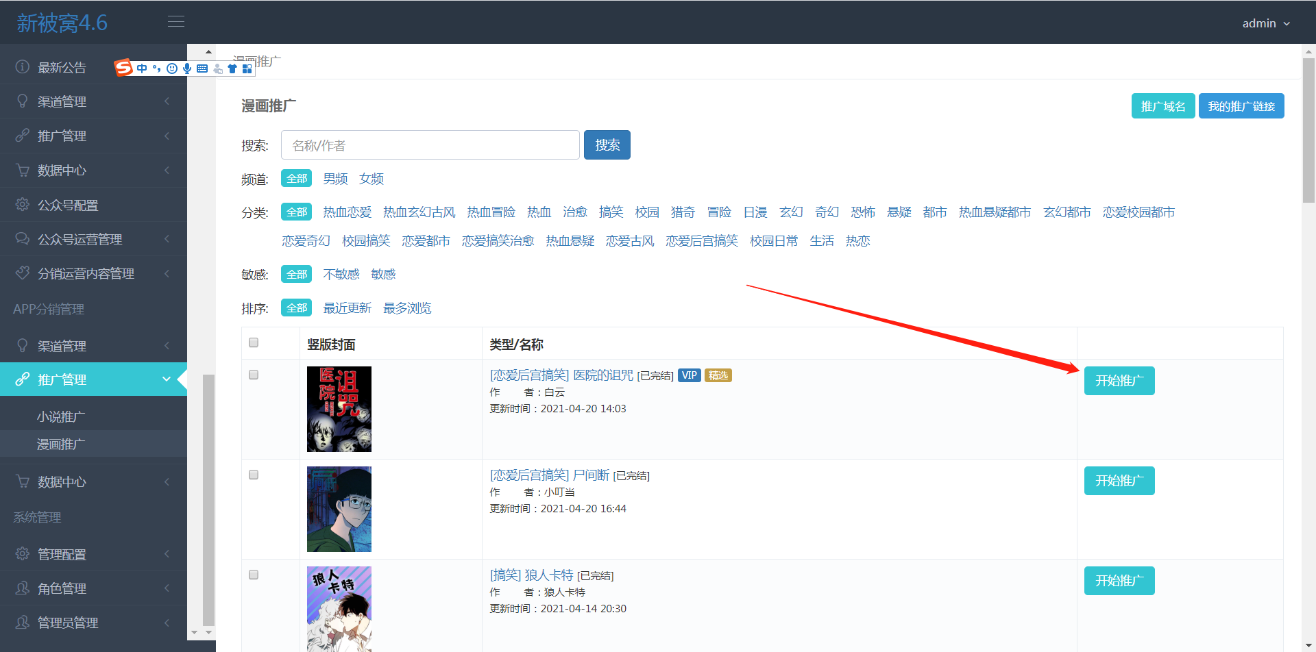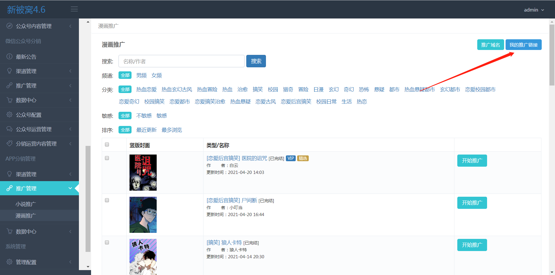 1、点击漫画列表的【开始推广】,进入章节列表,(章节列表里只会显示免费章节,且最多显示前二十章)