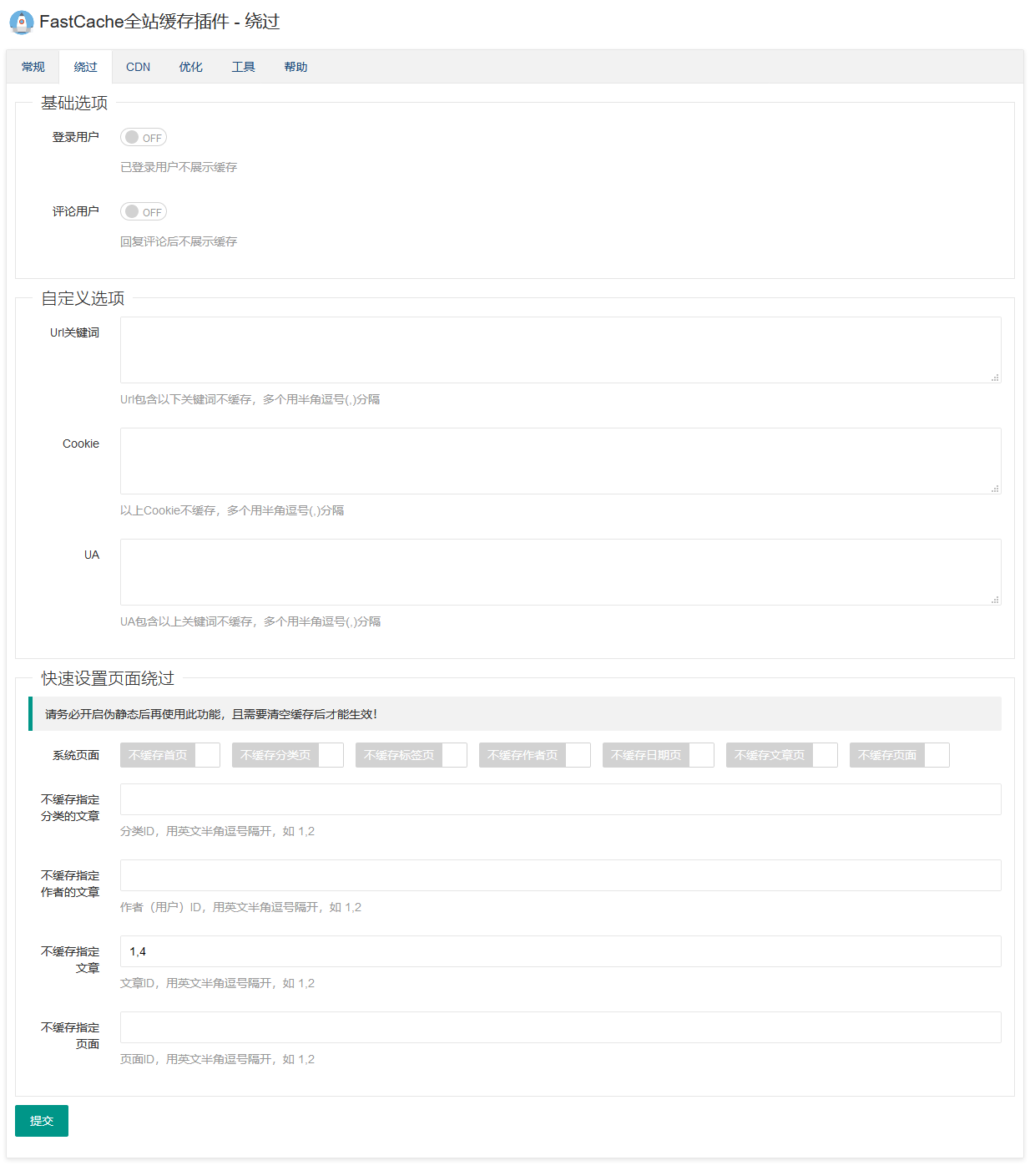 6. * 支持自定义绕过规则,可设置存在url关键词、cookie、UA等不展示缓存,兼容任何动态插件。
