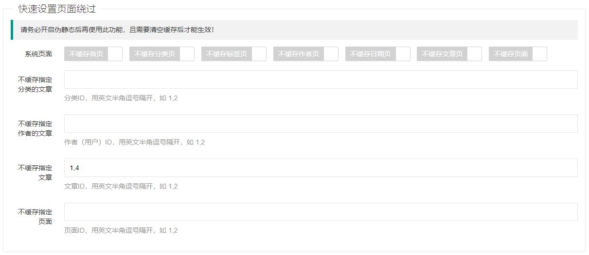 如果你不需要缓存某些类型的页面,可以在 `系统页面` 处勾选。特定的页面可以在下面单独设置。