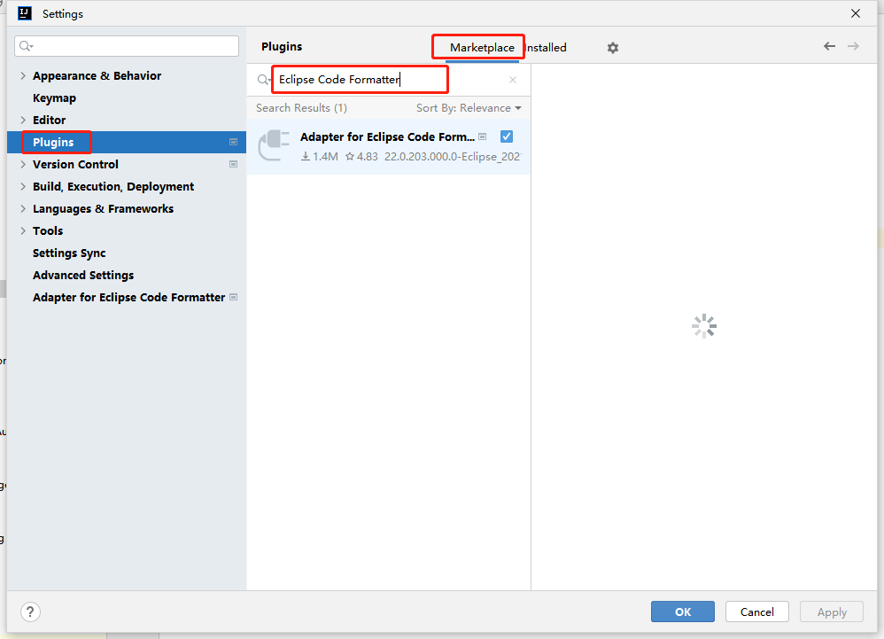 2. 下载eclipse格式化插件(阿里仅支持eclipse xml),idea->settings->plugins->搜索`Eclipse Code Formatter`