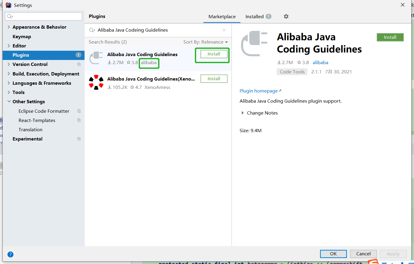 打开idea-Settings-plugin-搜索`Alibaba Java Codeing Guidelines` 选择install阿里提供的插件,并重启idea