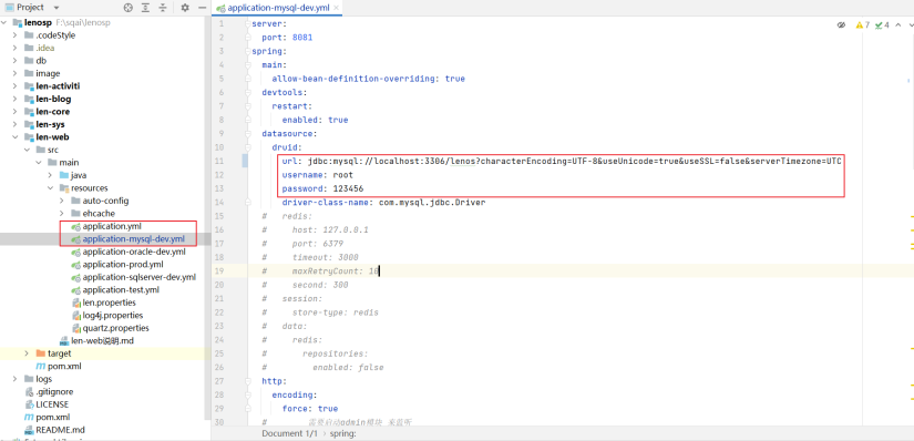 3. 修改配置文件,修改len-web模块下的 application.yml、application-mysql-dev.yml文件