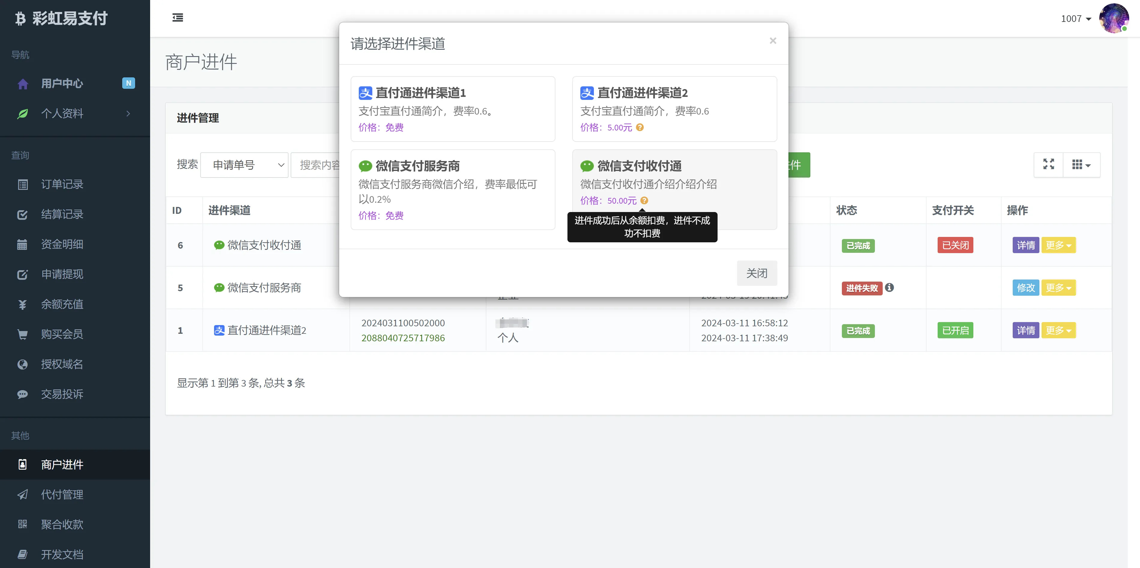 支持管理员后台和用户中心提交进件,支持付费进件,用户组限制等功能。 进件失败后支持修改现有信息重新提交。 进件成功后可自由开关该子商户的支付功能。 进件成功后支持修改结算账户。