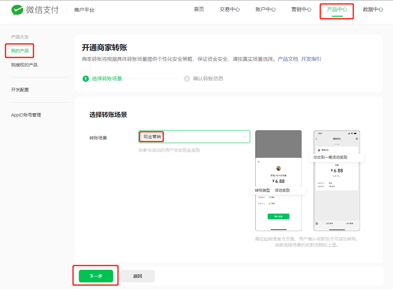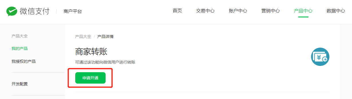 进入「商户平台 \-> 产品中心 -> (运营工具模块)商家转账」-> 前往功能