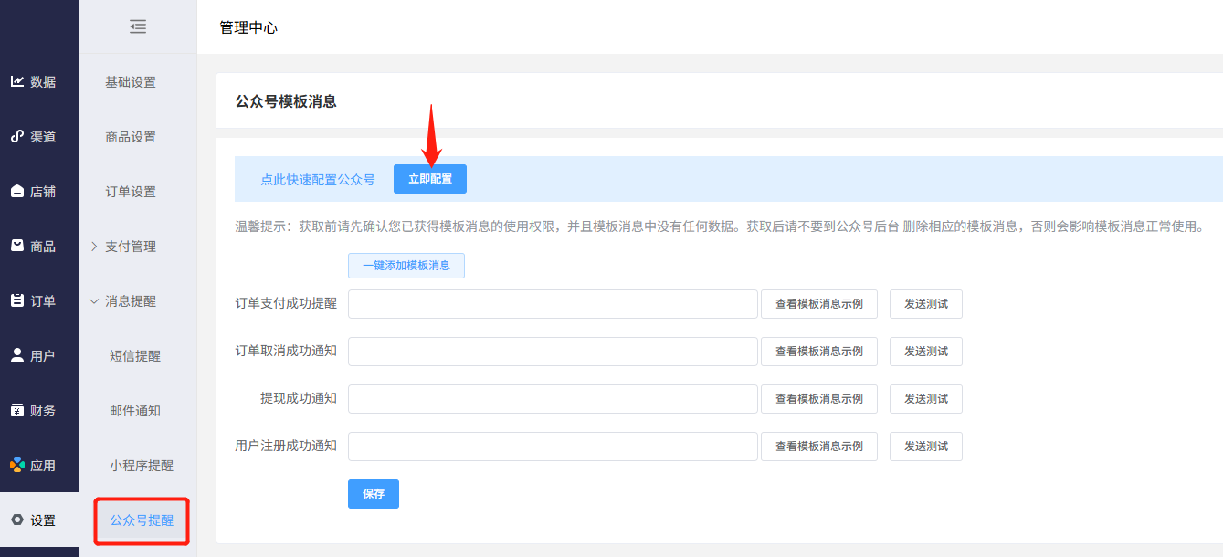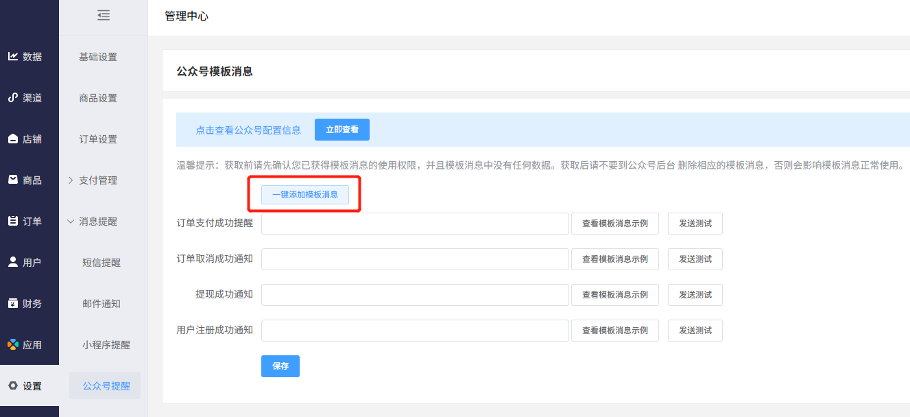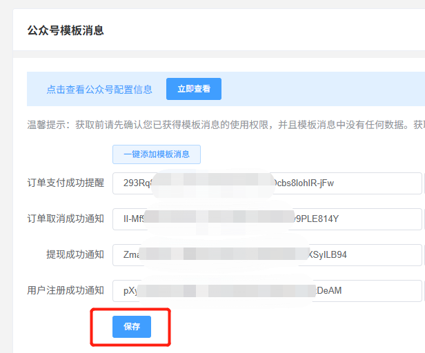 绑定成功后,点击“一键添加模板消息”,然后点“保存”,即配置完成