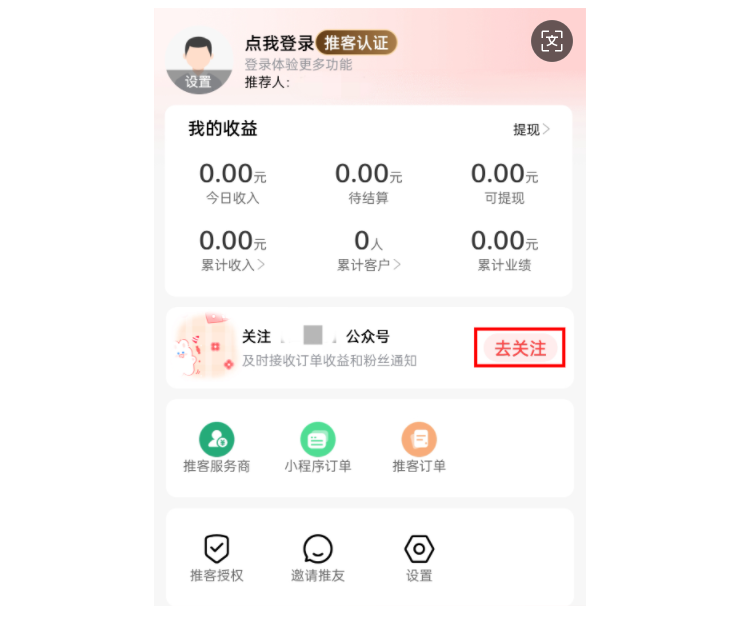 用户成为“推客”后,在推客中心,点击“去关注”,即可收到通知
