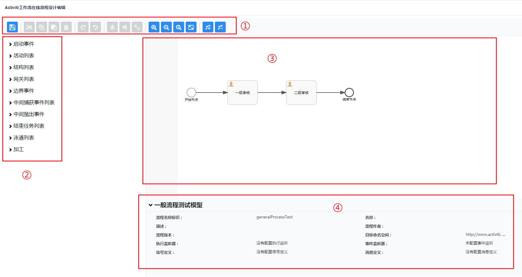可以看到流程设计器由四部分组成: